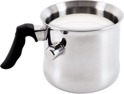 Praktičan nehrđajući lonac za mlijeko s vodenim plaštom zapremnine 1,5 l idealan je za svakodnevno kuhanje. Zahvaljujući vodenom plaštu mlijeko ni umaci se ne pripaljuju, zviždaljka upozorava na vrenje, a kvalitetan inox ravnomjerno raspoređuje toplinu. Pogodan za sve vrste štednjaka, uključujući indukciju, te se može prati u perilici posuđa.