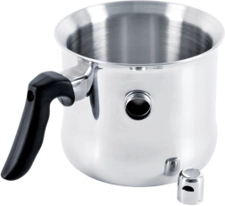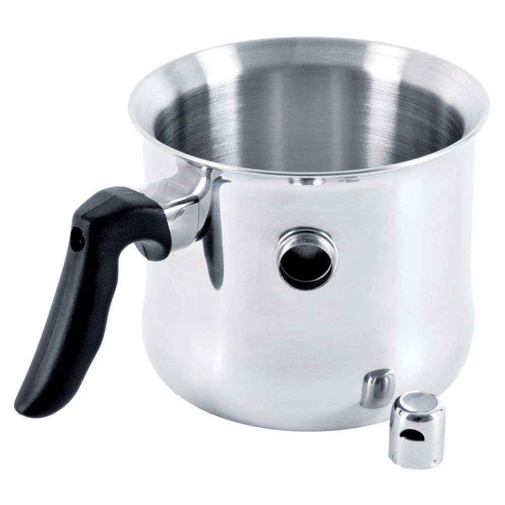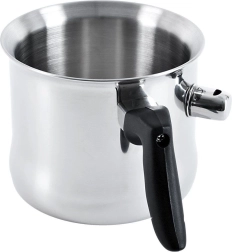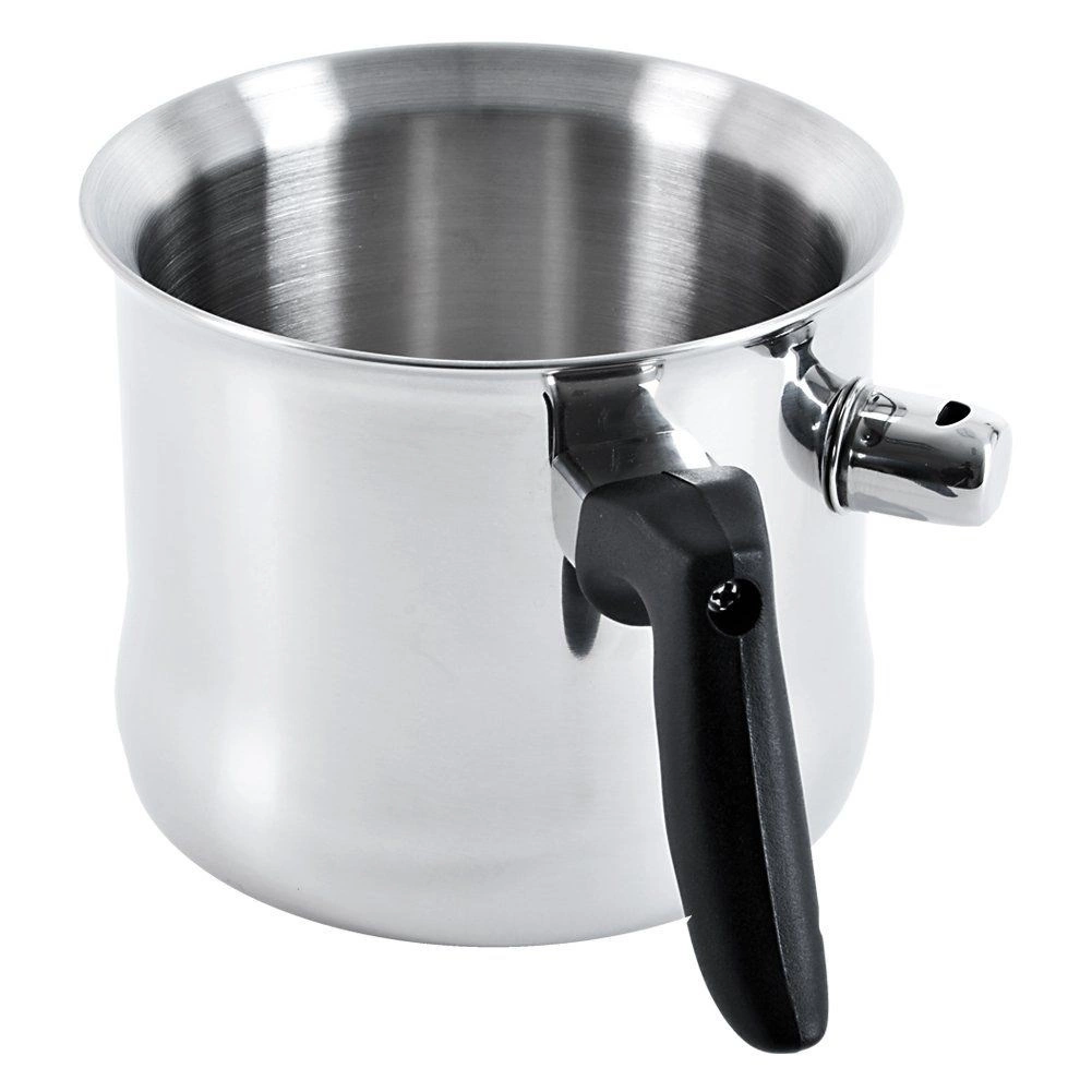 Ovaj lonac za mlijeko s dvostrukom stijenkom i vodenim plaštom odličan je izbor za nježno zagrijavanje mlijeka, čokolade, pudinga ili finih umaka. Dovoljno je odvrnuti zviždaljku, uliti vodu u plašt i kuhati – čim je mlijeko gotovo, ventil zazviždi. Ergonomska crna ručka ugodno leži u ruci i osigurava sigurnu manipulaciju.