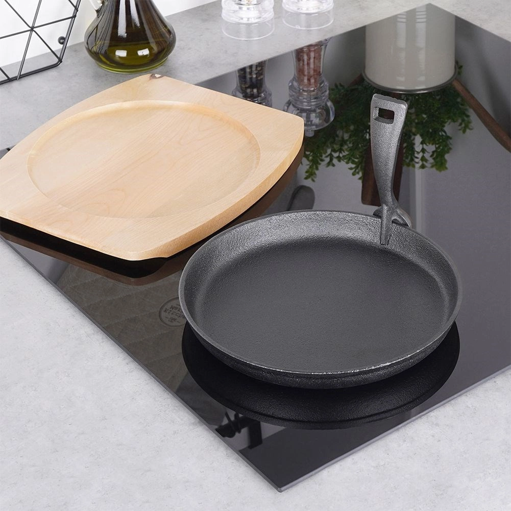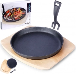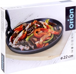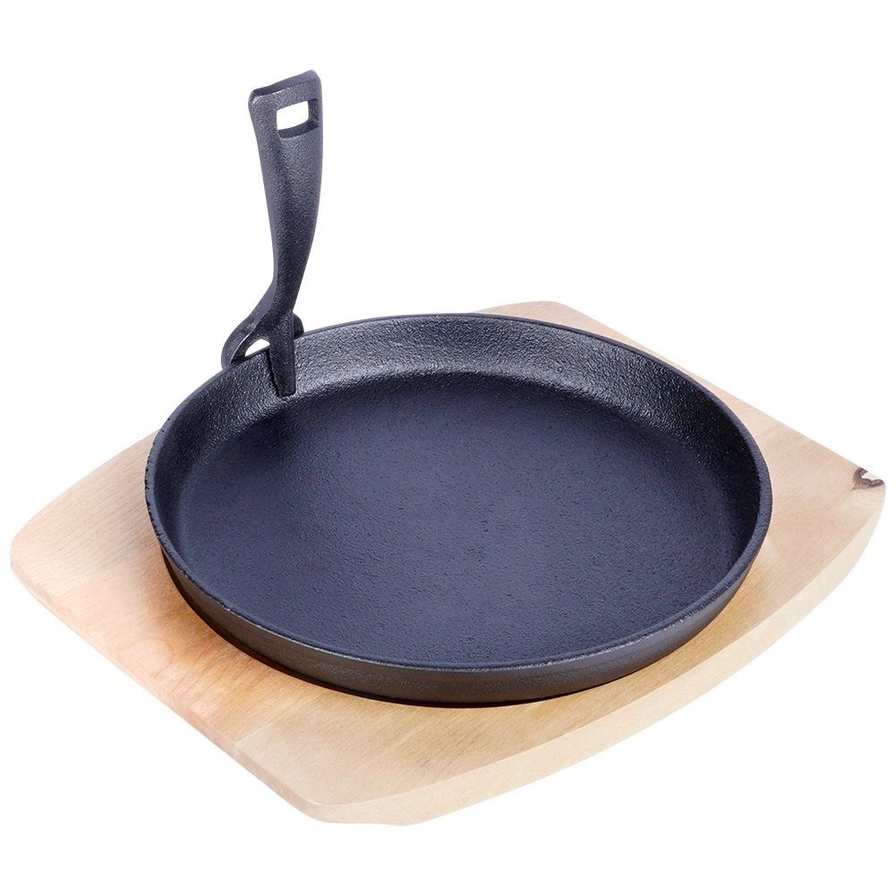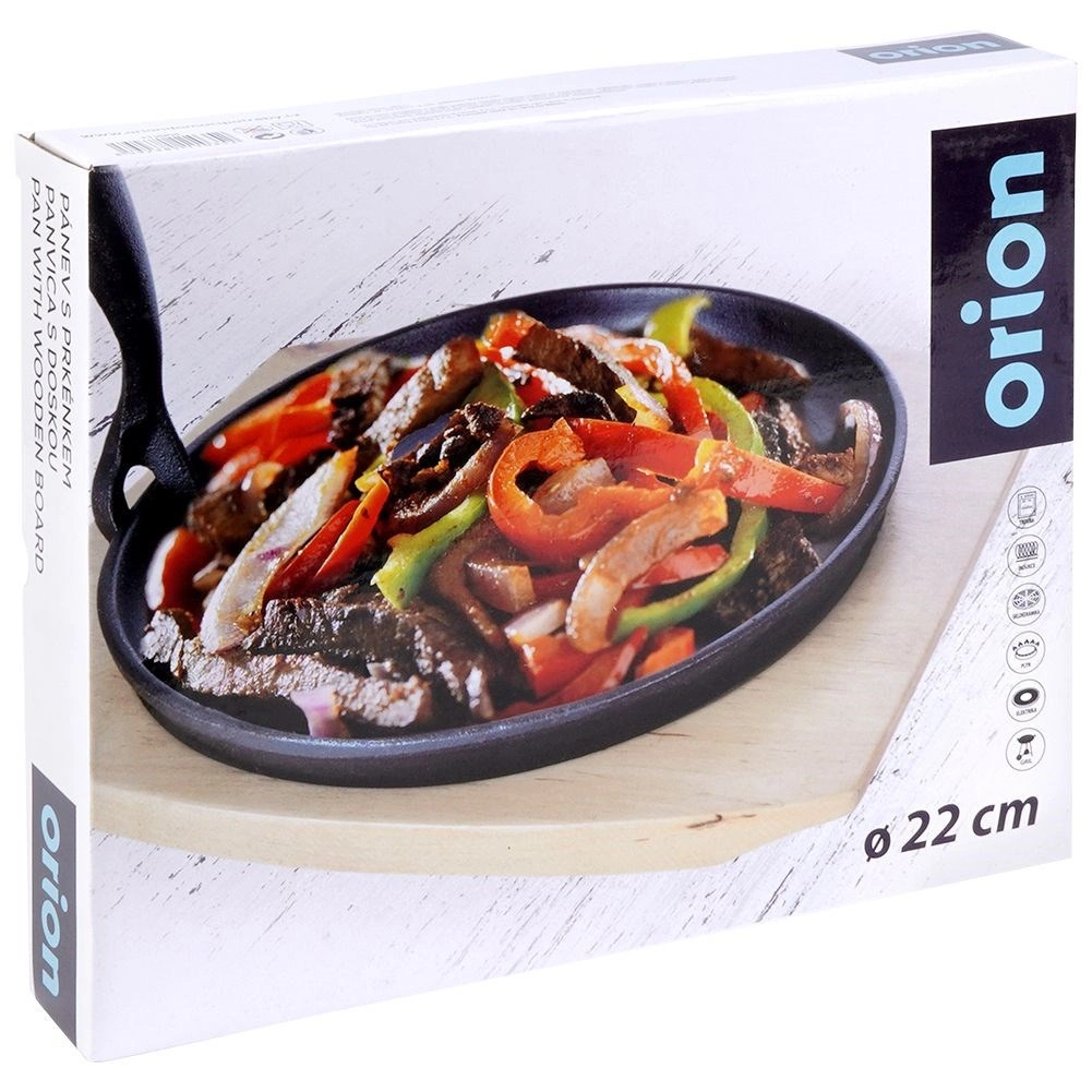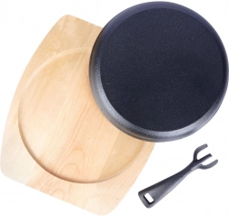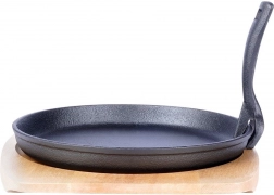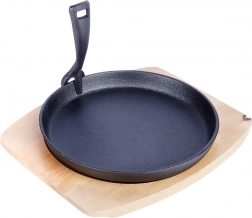 Univerzalna tava od lijevanog željeza za svakodnevno kuhanje i atraktivno posluživanje izravno na stolu. Masivno lijevano željezo brzo i ravnomjerno se zagrijava, dugo drži temperaturu i održava jela toplima i tijekom posluživanja. Uključen je čvrst drveni pladanj koji štiti površine od topline i olakšava prenošenje.