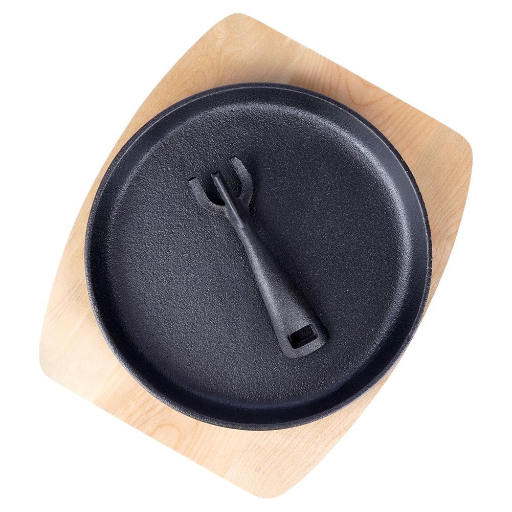 Praktična odvojiva drška olakšava rukovanje vrućom tavom. Drvena daska služi kao podložak i pladanj za prenošenje na stol.