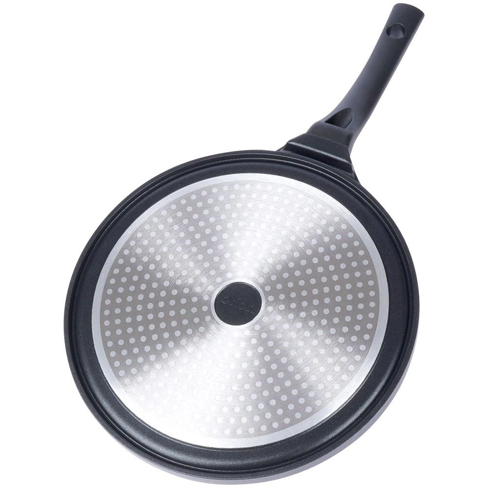 Masivno tijelo od aluminijskog lijeva odlično provodi i akumulira toplinu, čime štedi energiju i skraćuje vrijeme pripreme. Nizak rub i ravno dno olakšavaju ulijevanje tijesta i glatko klizanje gotove palačinke na tanjur. Ergonomska drška od izdržljivog materijala se tijekom kuhanja ne pregrijava i nudi siguran hvat.