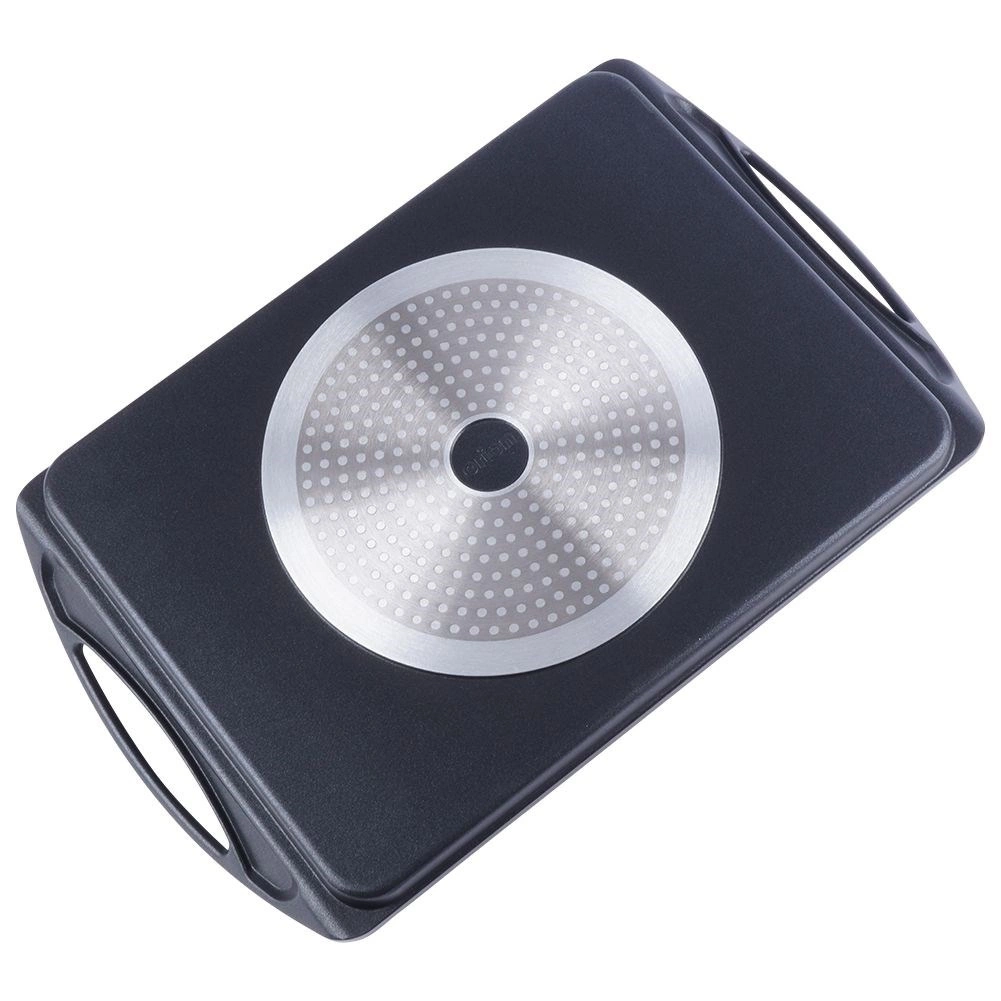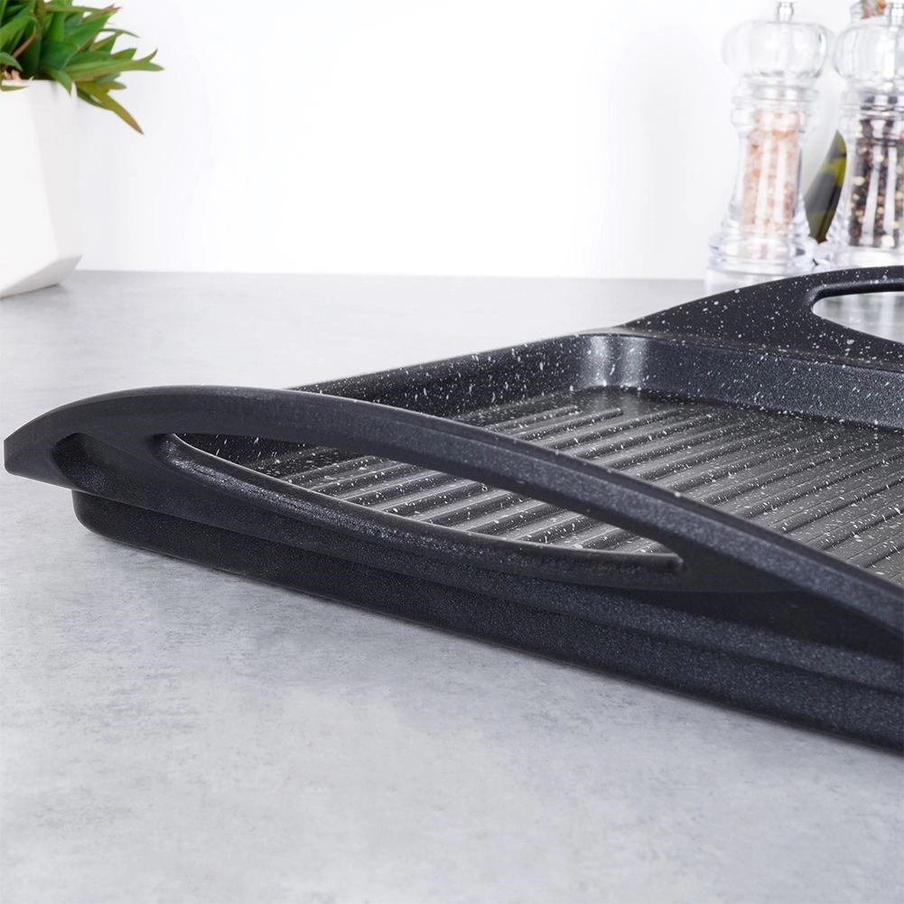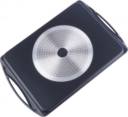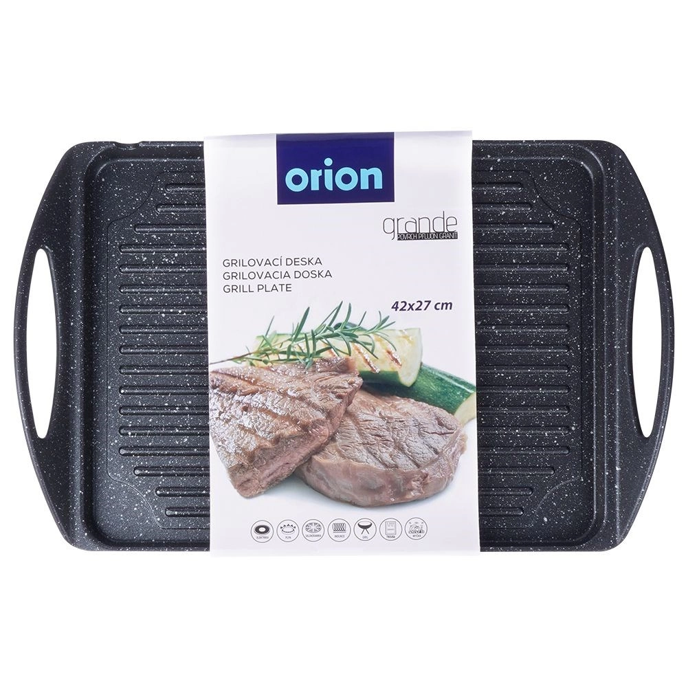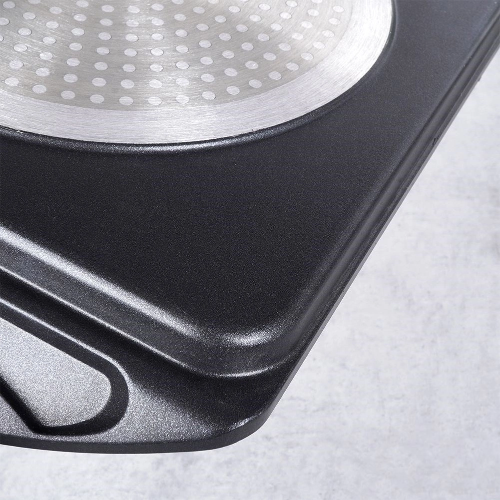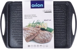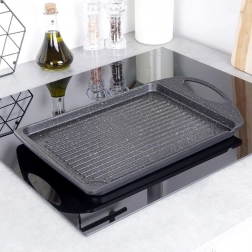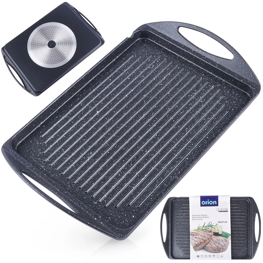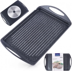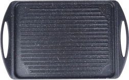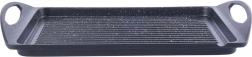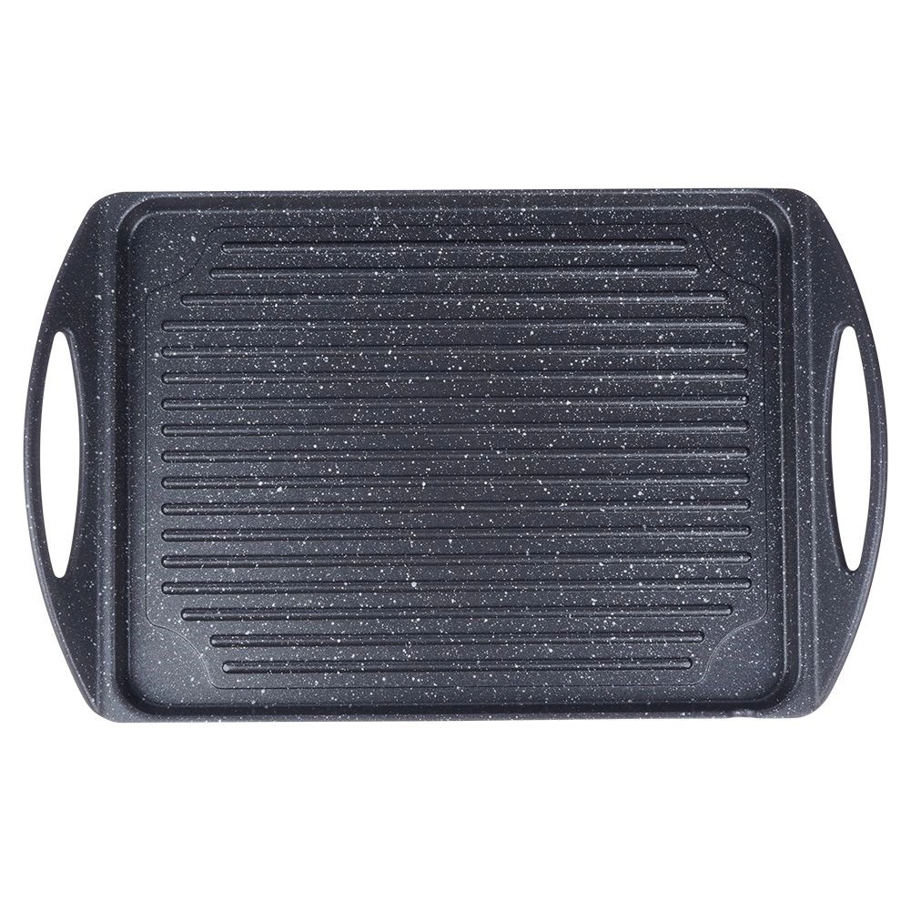 Praktična grilna ploča dimenzija 42 × 27 cm s robusnim aluminijskim tijelom i granitnim neljepljivim premazom PFLUON GRANIT za ravnomjernu raspodjelu topline. Rebrasta površina stvara tipične otiske roštilja i odvodi masnoću, a integrirane ručke olakšavaju rukovanje. Prikladna za plinske, električne, staklokeramičke i indukcijske štednjake, za pećnicu i za vrtni roštilj. Bez PFOA i PTFE, lako se čisti i prikladna je za perilicu posuđa.
