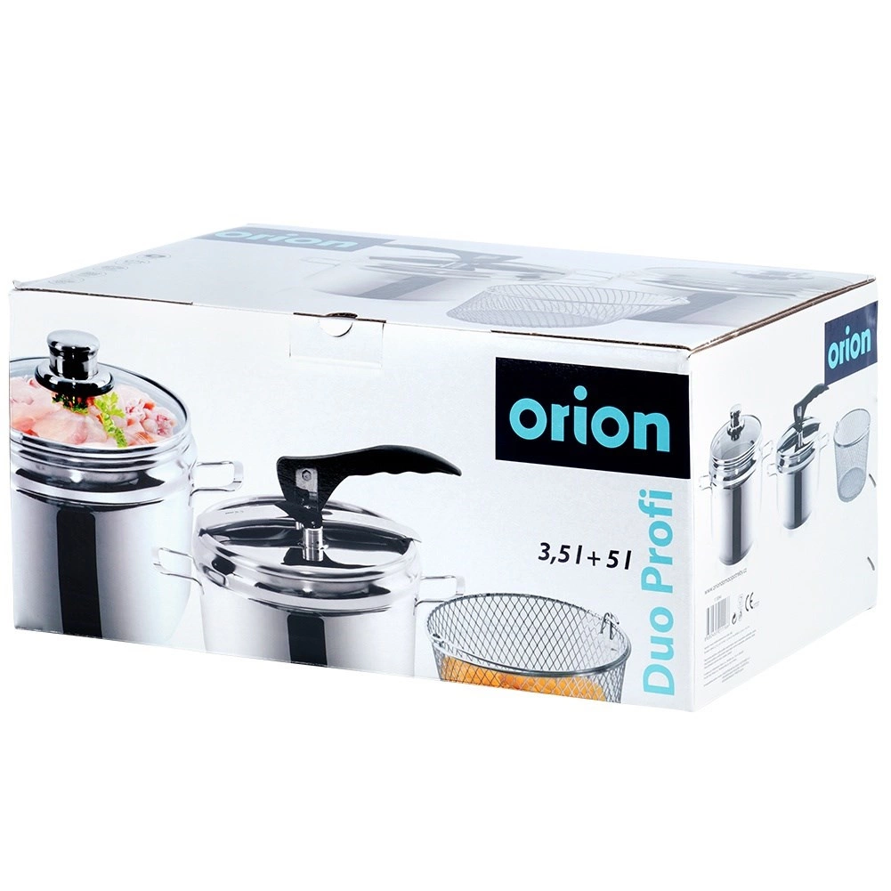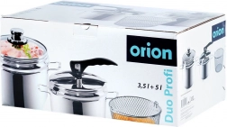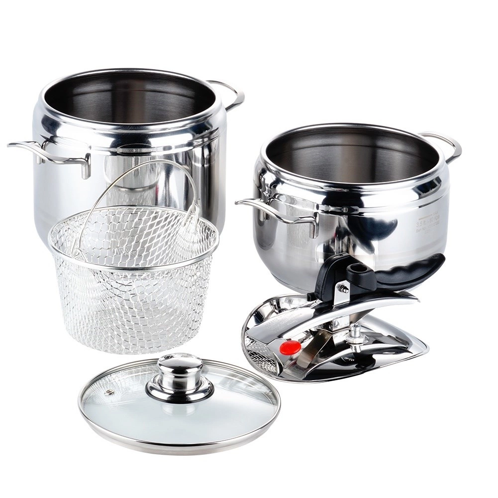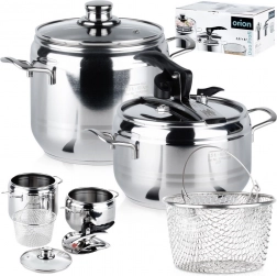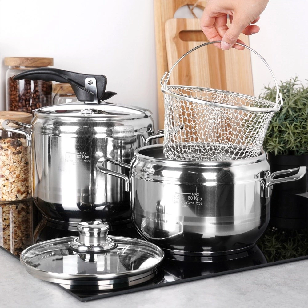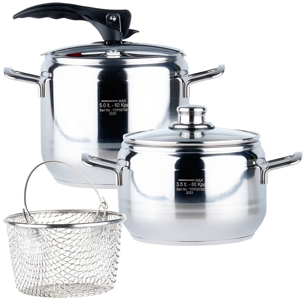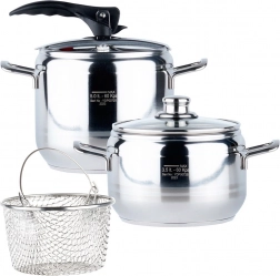 Praktičan set dvaju lonaca pod tlakom od nehrđajućeg čelika zapremine 3,5 i 5 l, s univerzalnom uporabom na svim vrstama štednjaka, uključujući indukciju. U kompletu su poklopac za tlak, stakleni poklopac i metalna košara za kuhanje, cijeđenje ili prženje. Masivno troslojno dno osigurava ravnomjernu raspodjelu topline, 2 sigurnosna ventila i regulacija tlaka donose mir pri kuhanju. Zahvaljujući kuhanju pod tlakom lonac je brz i energetski učinkovit, a bez poklopca ga lako operete u perilici posuđa.