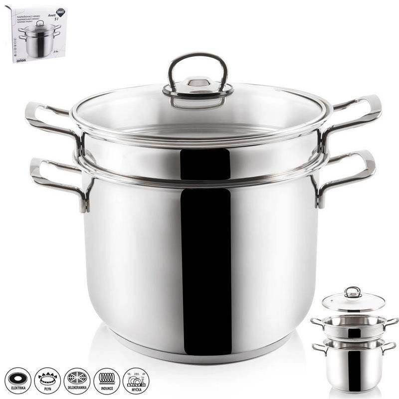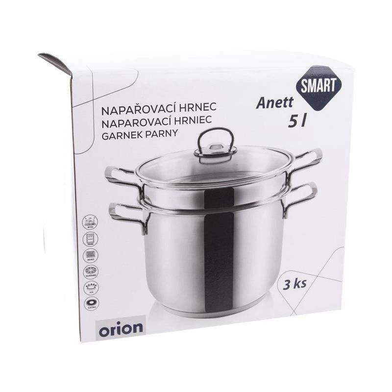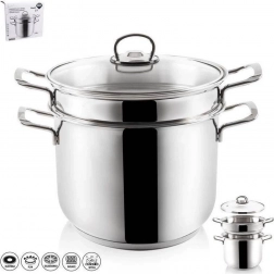 Dio seta je stakleni poklopac s ventilom za siguran izlaz pare i ergonomska parna košara s perforiranim dnom i udobnim rukohvatima. Vanjska strana je polirana do visokog sjaja za elegantan izgled i lako čišćenje. Lonac je kompatibilan sa svim vrstama štednjaka uključujući indukciju i može se prati u perilici posuđa.