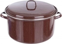 Ovaj univerzalni poklopac izrađen je od visokokvalitetnog emajliranog čelika u elegantnoj smeđoj boji s nježnim točkastim uzorkom. Odgovara posuđu promjera 32 cm, a zahvaljujući čvrstom prihvatu jednostavno se koristi. Emajl je higijenski, zdravstveno ispravan i pogodan za alergičare.