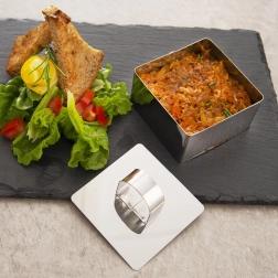 Kvadratni kalup s potiskivačem stvara savršeno ravne rubove i ujednačene porcije za profesionalnu prezentaciju jela.