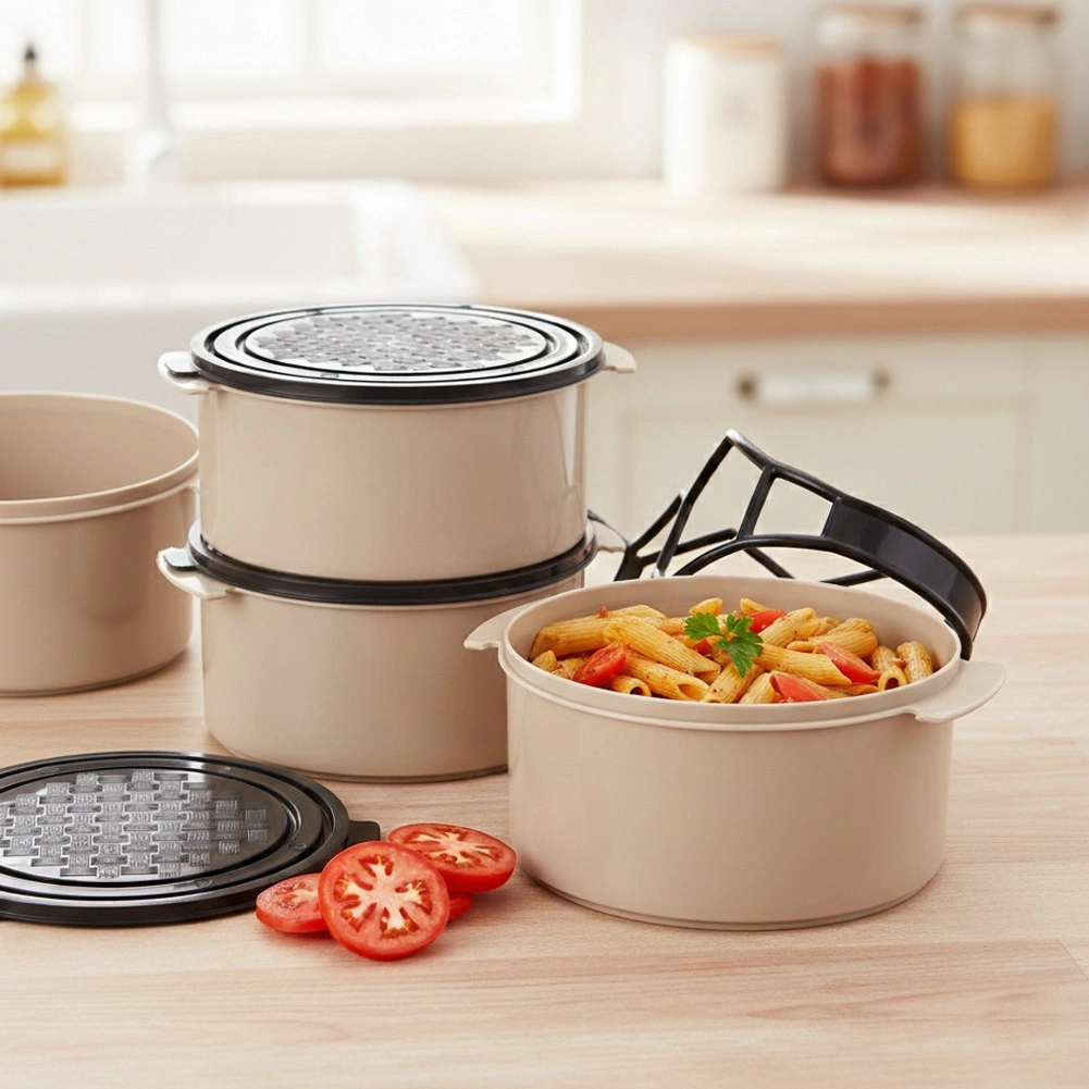 Velik kapacitet za glavno jelo, priloge i desert. Svaka posuda ima vlastiti poklopac i čuva hranu odvojeno i pregledno.