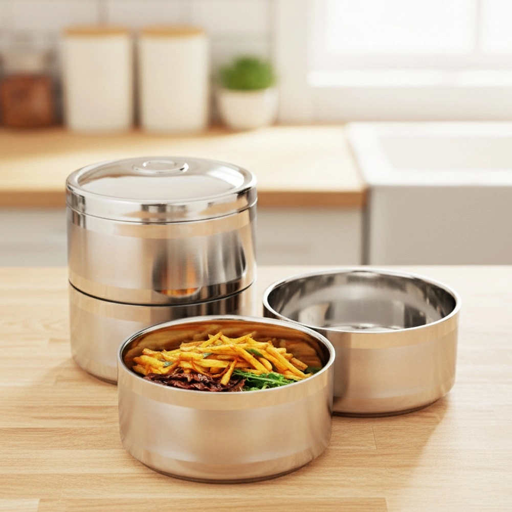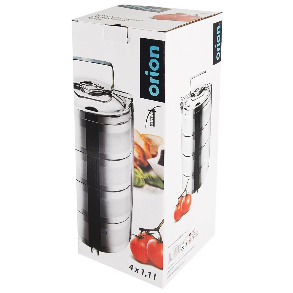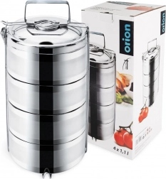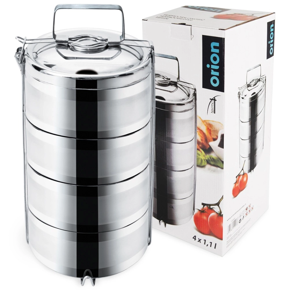 Višekatna termo posuda od kvalitetnog nehrđajućeg čelika idealna je za svakodnevno nošenje obroka i vikend izlete. Četiri zasebne posude omogućuju odvajanje juhe, glavnog jela i priloga, dok vakuumska izolacija pomaže dulje zadržati željenu temperaturu. Stabilan okvir sa zakretnim kopčama i gornjom ručkom olakšava siguran transport.