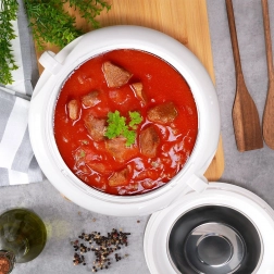 Poklopac se zatvara jednostavnim okretanjem, a masivna gornja ručka olakšava rukovanje. Termoposuda nije 100% nepropusna – tekuća jela zato prenosite u uspravnom položaju. Za bolje zadržavanje temperature prije uporabe je prethodno zagrijte vrućom vodom (1–2 minute) ili, za hladna jela, ohladite u hladnjaku približno jedan sat.