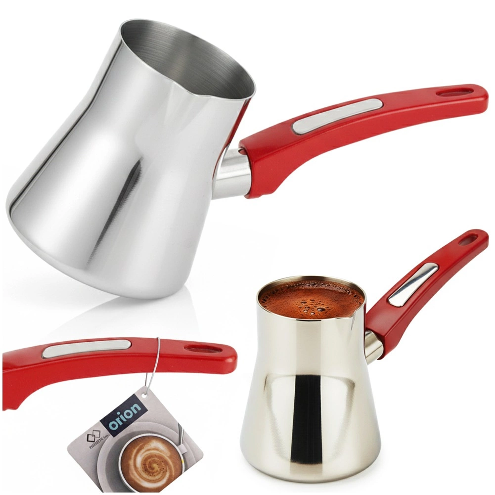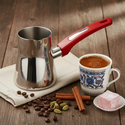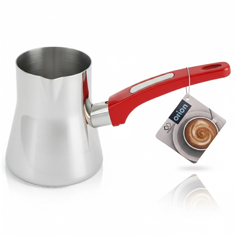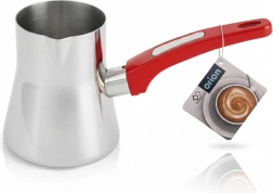 Ova elegantna džezva (cezve/ibrik) od nehrđajućeg čelika nezamjenjiva je za pripremu autentične turske kave. Zapremnina 330 ml idealna je za jednu do dvije porcije, praktični kljun omogućuje precizno točenje bez prolijevanja, a ergonomska crvena drška nudi siguran i udoban hvat.