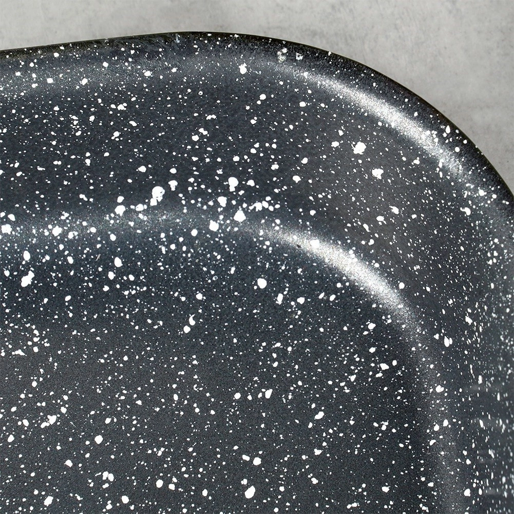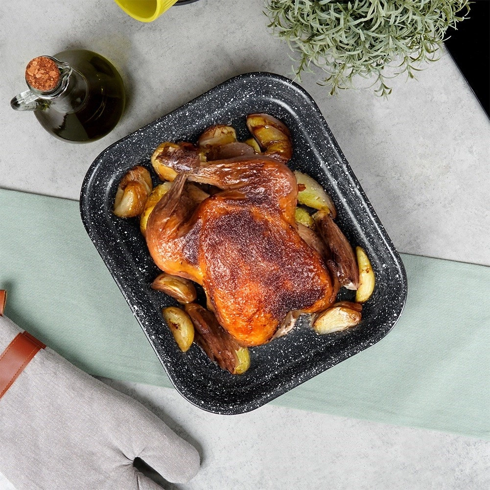 Robustan čelični pekač s emajliranim tijelom i granitnom, visoko otpornom neljepljivom površinom osigurava ravnomjerno pečenje i jednostavno vađenje jela. Unutarnja dimenzija 27 × 23 × 4 cm izvrsna je za pečenje piletine, povrća, kolača i domaće pizze.