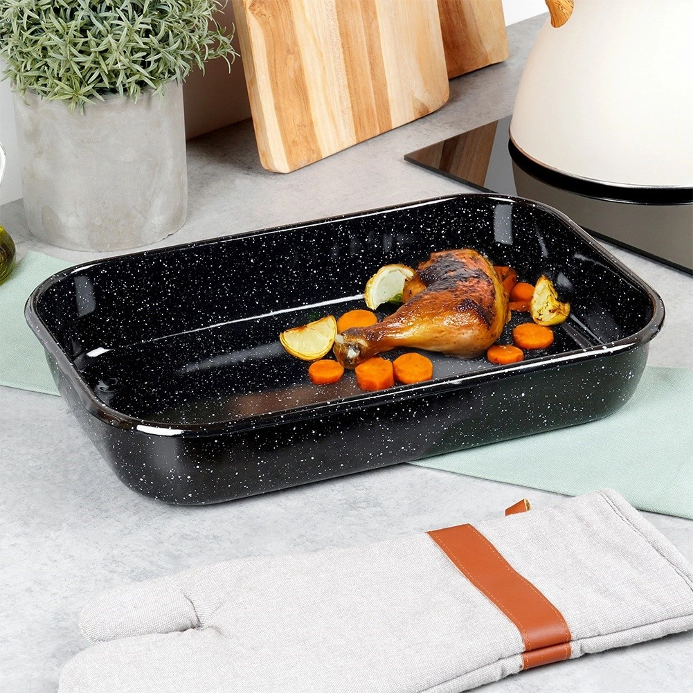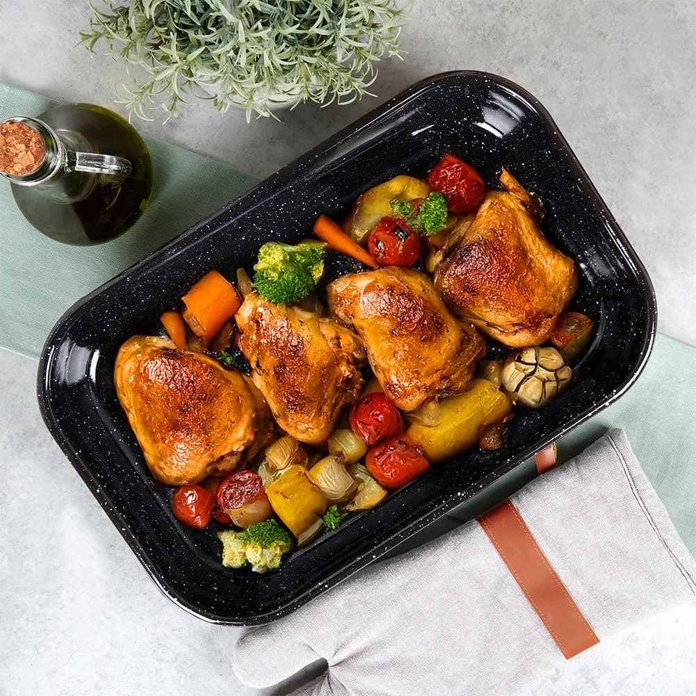 Pravokutni pekač od emajliranog čelika izdržljiv je, higijenski i odlično provodi toplinu za ravnomjerno pečenje jela. Emajl je siguran za zdravlje i pogodan i za alergičare. Zahvaljujući univerzalnim dimenzijama 38 × 24,5 × 7 cm (unutarnje 36 × 22,5 × 6 cm) prikladan je za pečenje mesa, povrća, složenaca i deserata.