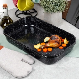 Robustan emajlirani pekač dimenzija 42 × 27 × 7 cm (unutarnje 39 × 25 × 7 cm) odličan je izbor za svakodnevno kuhanje i pečenje. Emajlirana površina je higijenska, izdržljiva i pogodna i za alergičare. Visoki rubovi osiguravaju ravnomjerno pečenje i dovoljno mjesta za sokove i priloge.