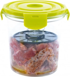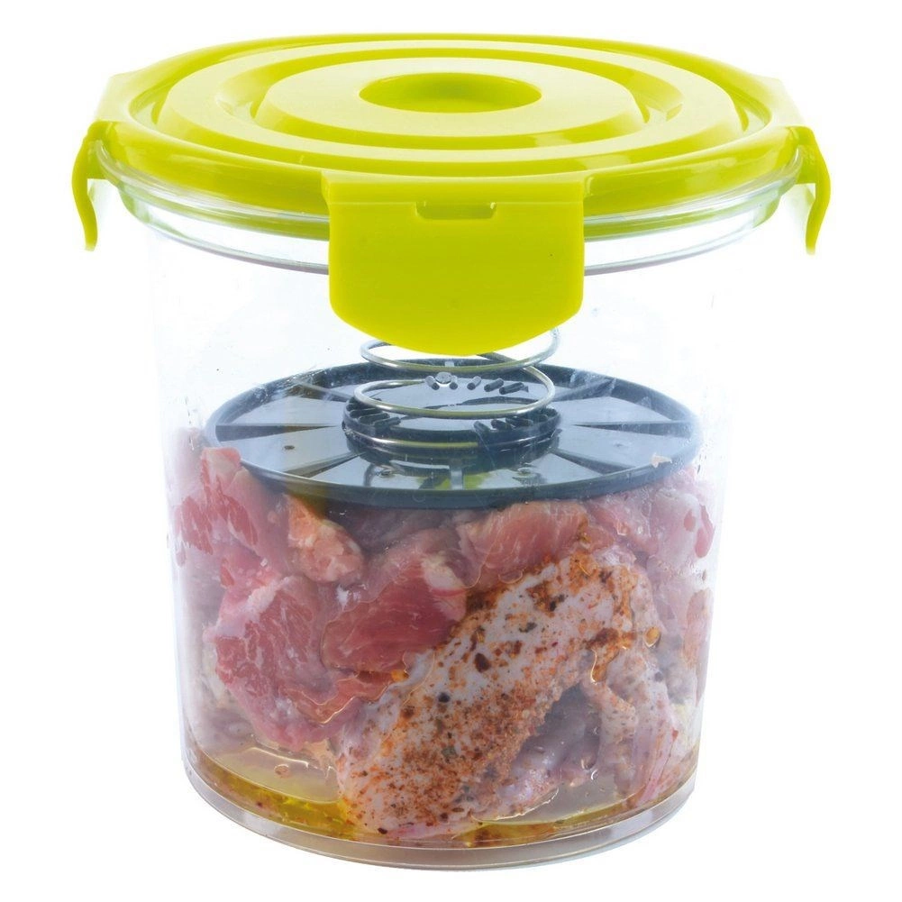 Čvrst, proziran spremnik omogućuje da sadržaj bude stalno pod kontrolom, a zahvaljujući opružnoj ploči održava sastojke ravnomjerno pritisnutima ispod površine. To poboljšava prodiranje začina, smanjuje potrebu za velikom količinom ulja ili naljeva i pomaže postići intenzivan okus.