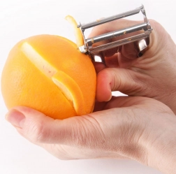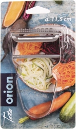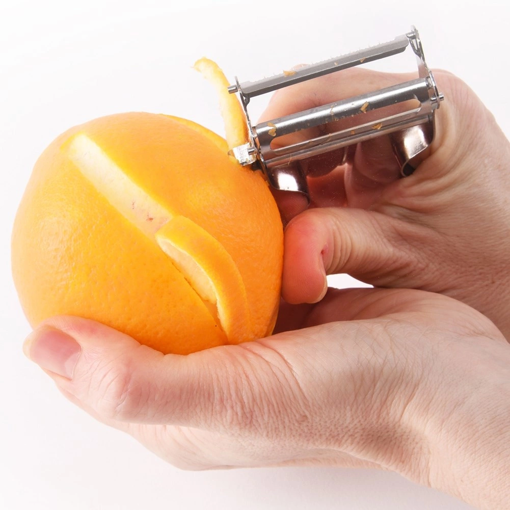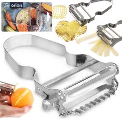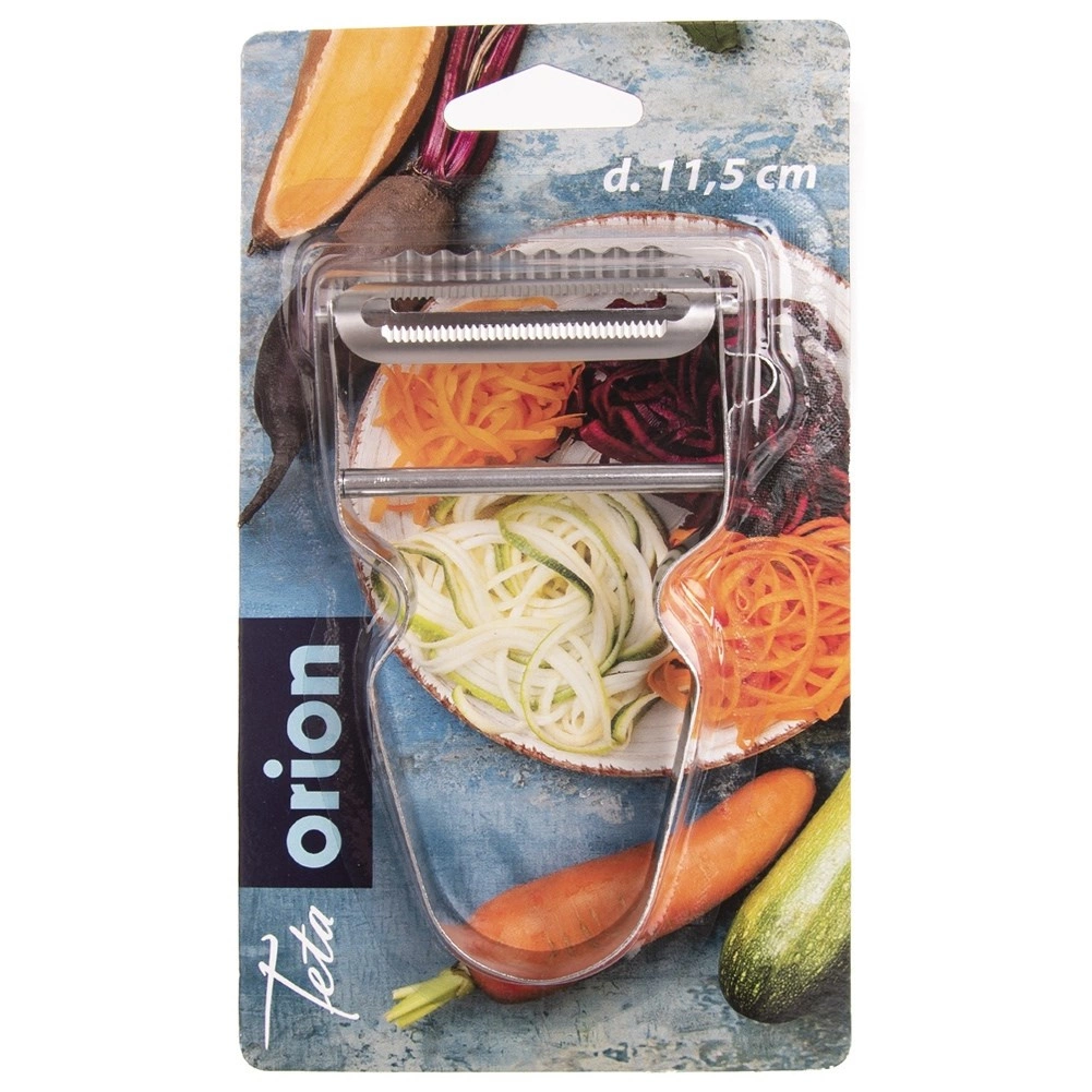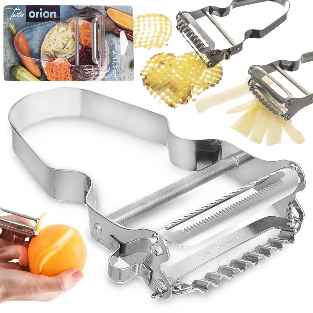 Ovaj svestrani inox gulilac olakšava pripremu povrća i voća – od krumpira i jabuka do rajčica. Dvije oštre oštrice savladavaju klasično guljenje, rezanje tankih ploški te ukrasne valovite rezove i fine julienne trakice za salate i dekoracije.