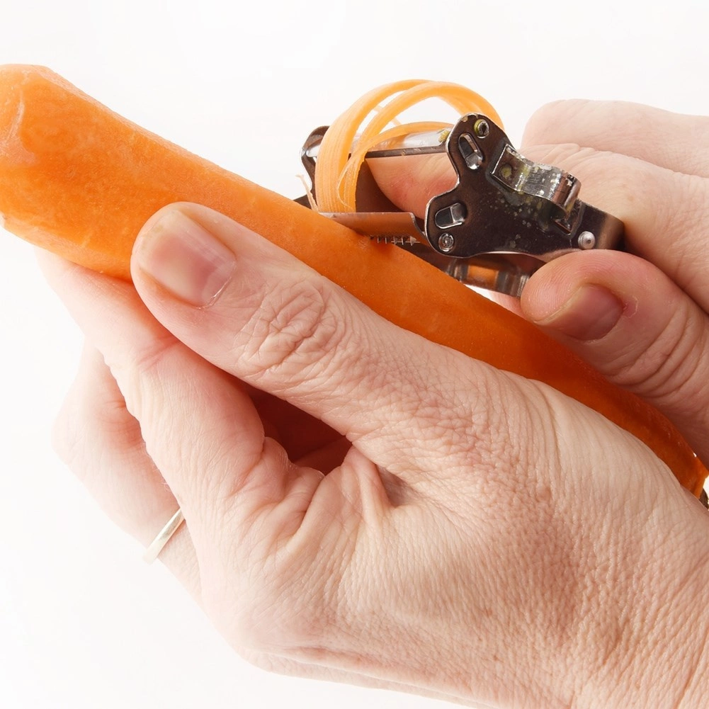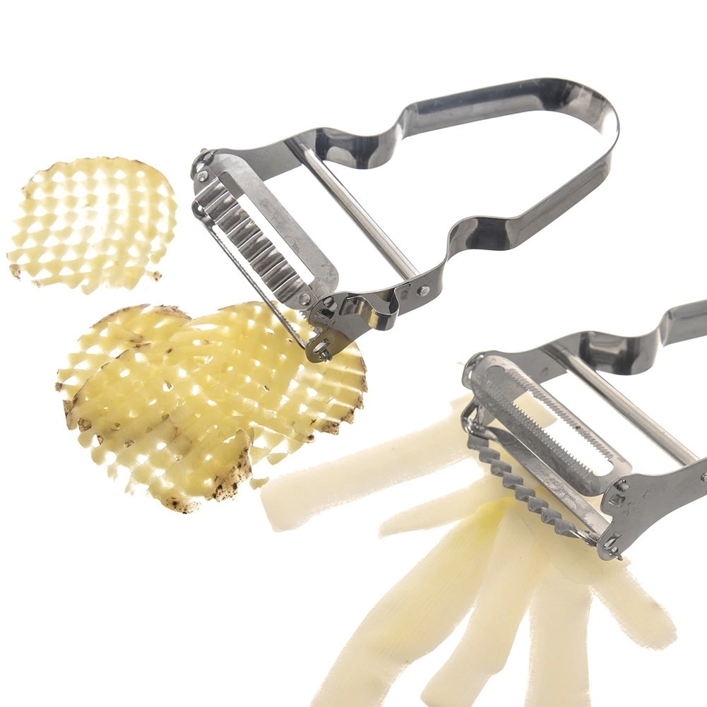 Jedna oštrica za brzo guljenje, druga za valovite ploške i fine trakice – idealno za hrskave čipse ili efektne ukrase od krumpira i povrća.