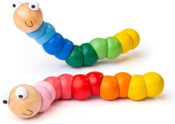 Ovaj šareni crvić idealna je prva motorička igračka za male ručice. Zahvaljujući glatkim drvenim segmentima i sigurnom spoju, djeca ga lako hvataju, okreću i savijaju – tako vježbaju hvat, koordinaciju ruka–oko i koncentraciju. Vesele boje privlače pozornost i potiču znatiželjnu igru.