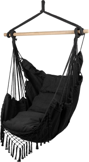 Uživajte u maksimalnom opuštanju sa stilskom visećom brazilskom foteljom u tamno sivoj boji. Udobnost osiguravaju dva jastuka i mekani naslon za glavu, a stabilnost čvrsta drvena prečka. Izdržljiva mješavina 65 % pamuka i 35 % poliestera ugodna je na dodir i dugotrajna. Praktični bočni džepovi drže sve potrebno pri ruci.