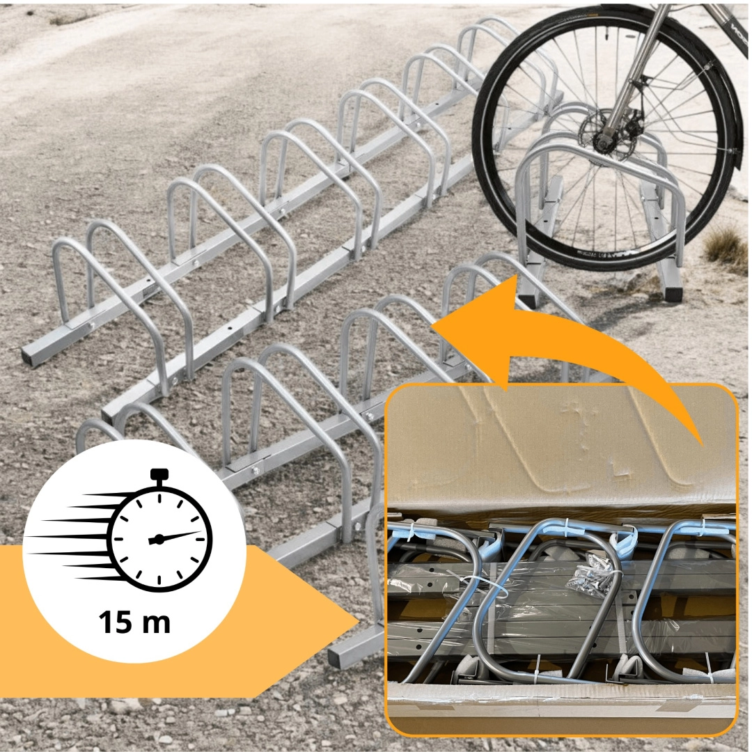 Robustan metalni stalak BITUXX za do 10 bicikala donosi savršen red i sigurno parkiranje kod kuće, na poslu i na javnim mjestima. Izdržljiv pocinčani čelik pouzdano odolijeva vremenskim uvjetima, dok promišljeni razmaci drže bicikle uspravno bez dodirivanja volana i okvira.
