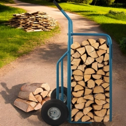 Jedna kolica za više zadataka: duboka košara za drva i praktična lopata za kutije ili vreće. Lako prevozi raznolike terete tijekom dana.