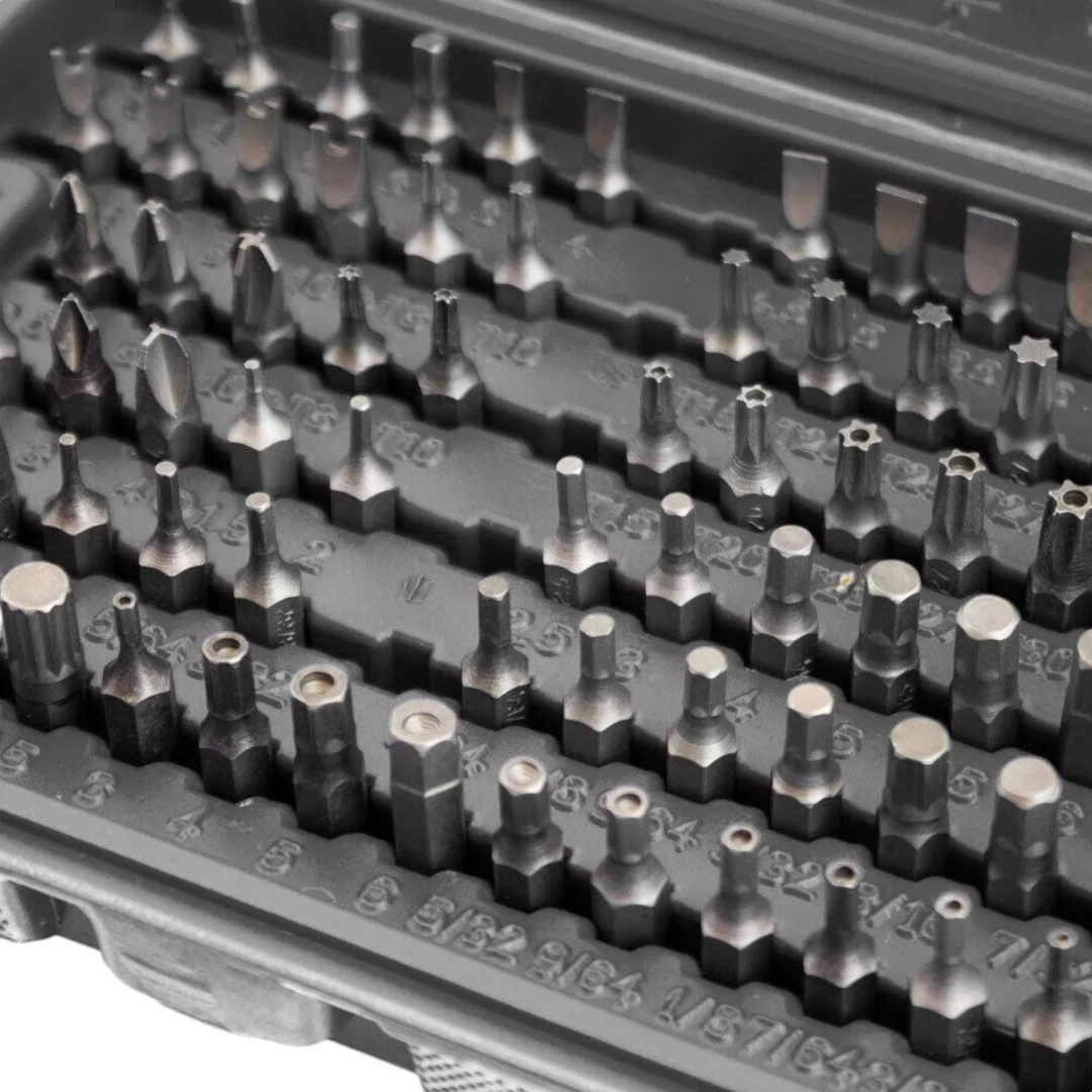 Svaki bit ima svoje predviđeno mjesto u čvrstoj plastičnoj kutiji. Lako ćete pronaći pravu veličinu i sve sigurno prenijeti.
