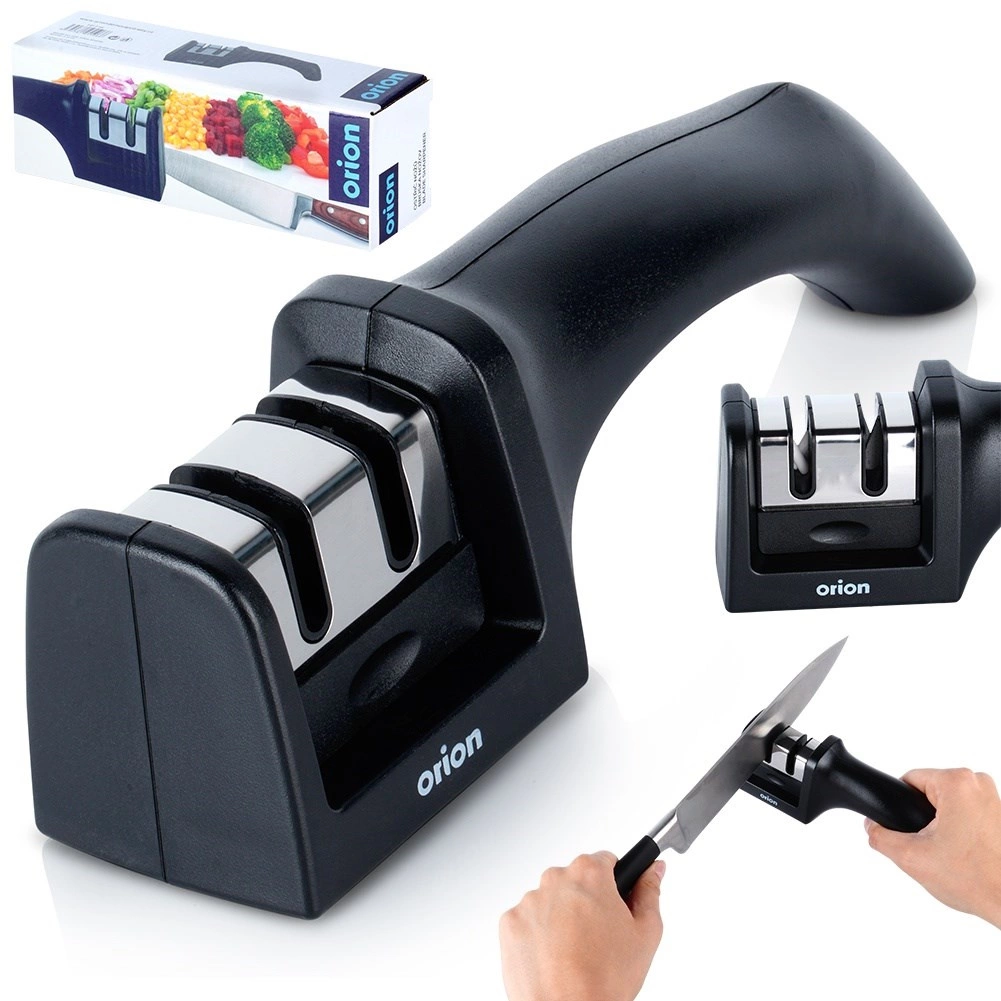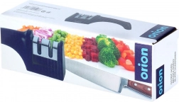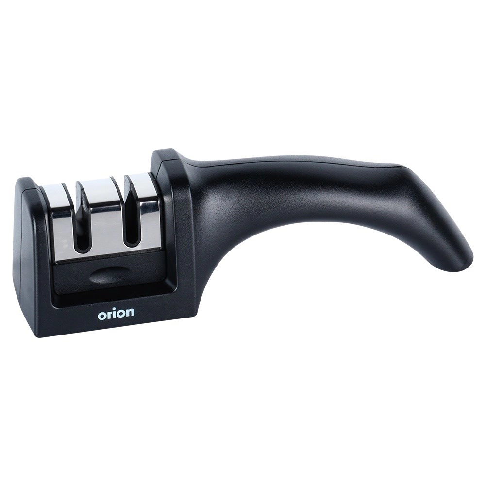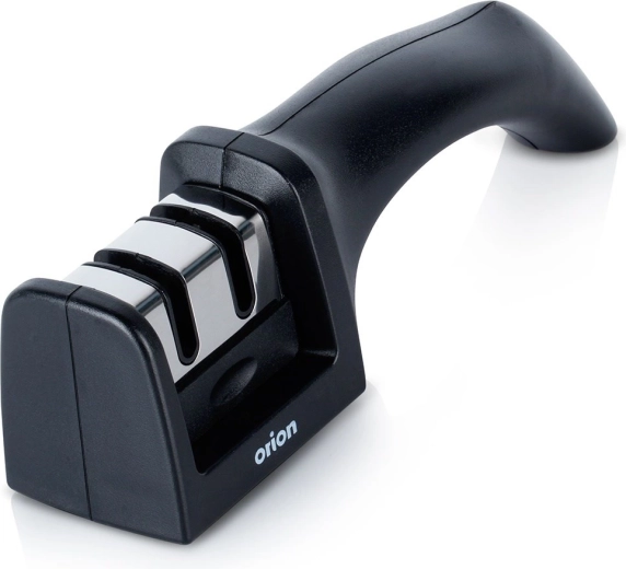 Priuštite svojim noževima preciznu njegu s dvofaznim brusom ORION. Prvi stupanj s karbidnom glavom brzo obnavlja otupljenu oštricu, dok je drugi stupanj s keramičkom uloškom nježno zaglađuje i polira za dugotrajnu oštrinu. Stabilno protuklizno postolje i oblikovan rukohvat osiguravaju sigurno držanje i pri većem pritisku.