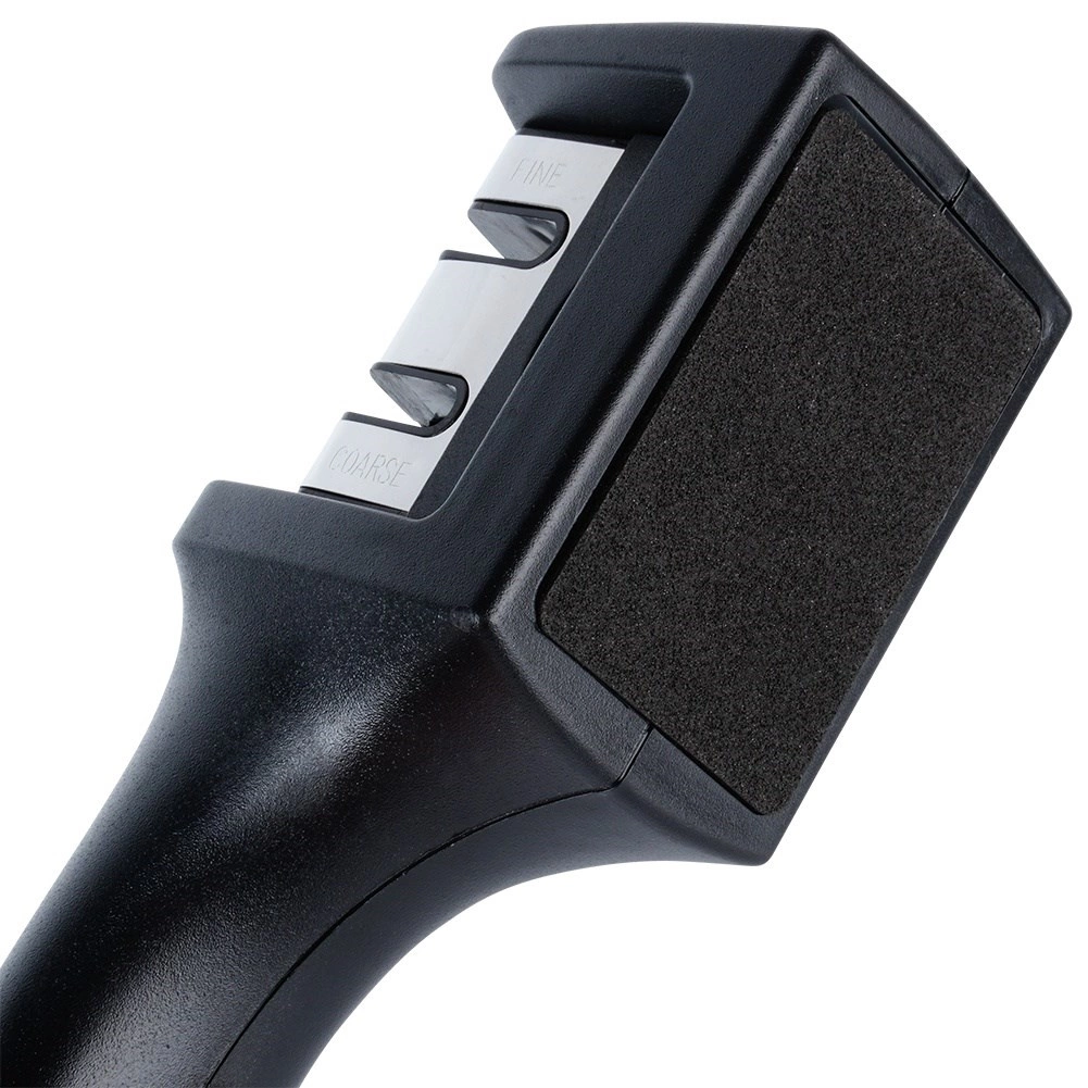 Grubi karbid obnavlja oblik oštrice, a fina keramika je zaglađuje i dodatno oštri – idealna kombinacija za svakodnevno održavanje noževa.