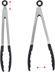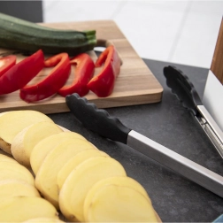 Ova univerzalna kuhinjska kliješta odličan su pomoćnik pri svakodnevnom kuhanju i roštiljanju. Nehrđajuća ramena osiguravaju čvrstoću i dug vijek trajanja, dok rebrasti silikonski vrhovi pružaju siguran hvat bez grebanja posuđa. Zahvaljujući ušici s prstenom za zaključavanje lako se objese i spremaju u zatvorenom položaju.