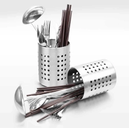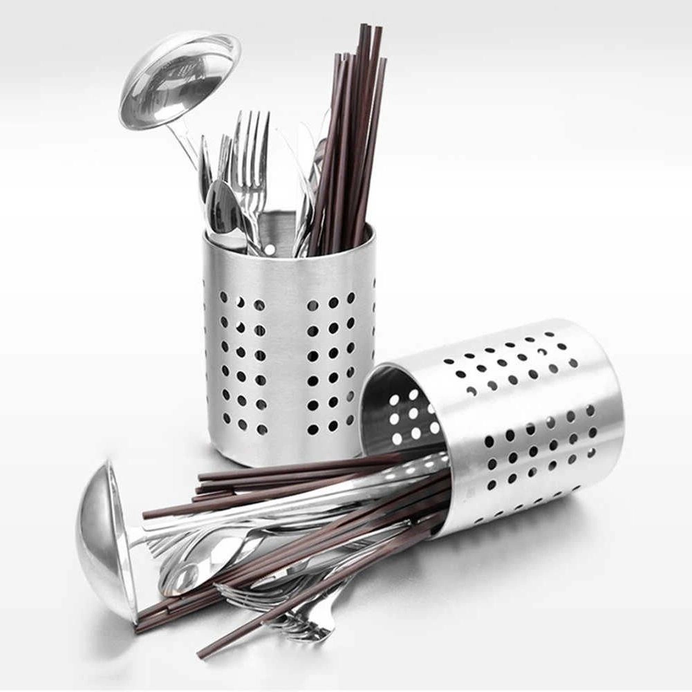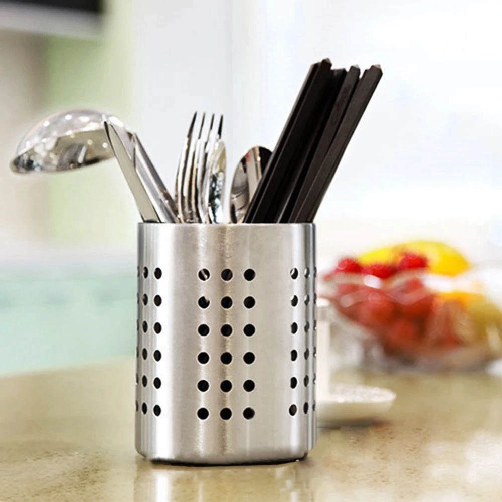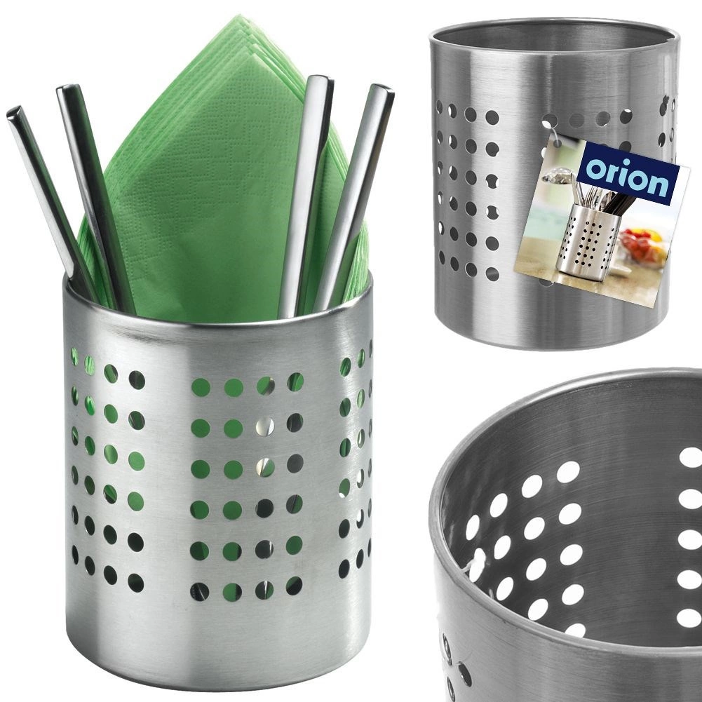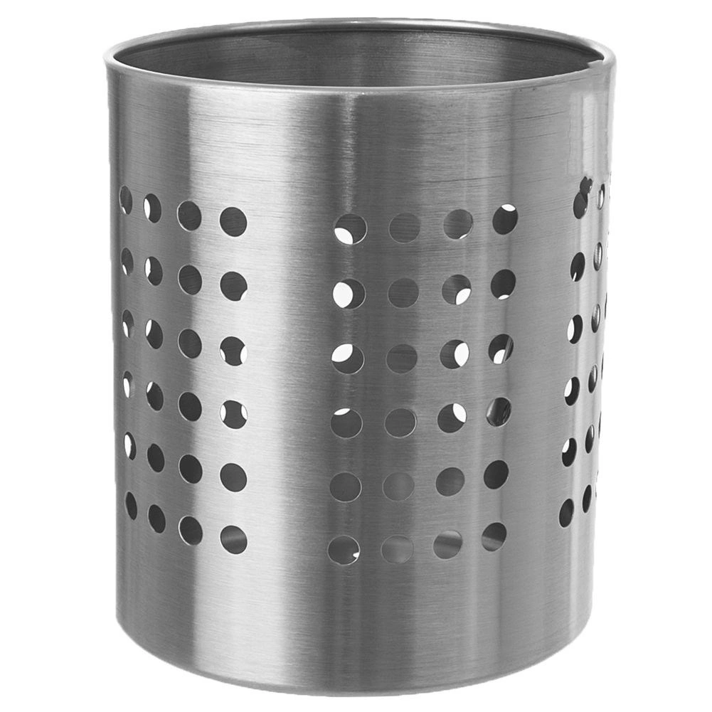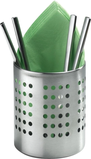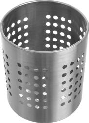 Praktičan stalak od nehrđajućeg čelika za pribor za jelo i kuhinjski alat, promjer 12 cm i visina 13 cm. Zahvaljujući perforiranim otvorima osigurava odvod vode i cirkulaciju zraka, pa pribor brže se suši i ostaje higijenski čist. Izdržljiv nehrđajući čelik u srebrnoj boji, univerzalna primjena kao ocjeđivač i organizator te klasičan dizajn koji se uklapa u svaku kuhinju.