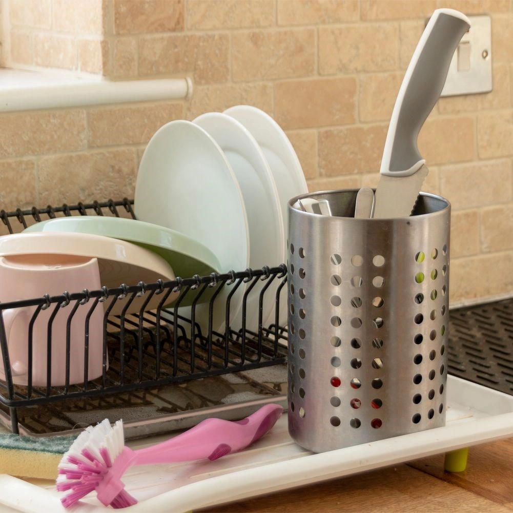 Održavajte red na kuhinjskoj radnoj plohi s ovim čvrstim i elegantnim stalkom od nehrđajućeg čelika. Perforirana konstrukcija potiče brzo sušenje i sprječava zadržavanje vlage, pa je idealna za odlaganje opranog pribora za jelo i kuhinjskih alata. Jednostavno se čisti, a zahvaljujući širokom otvoru omogućuje udobno spremanje i većih i manjih pomagala.