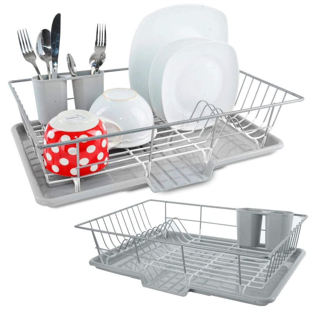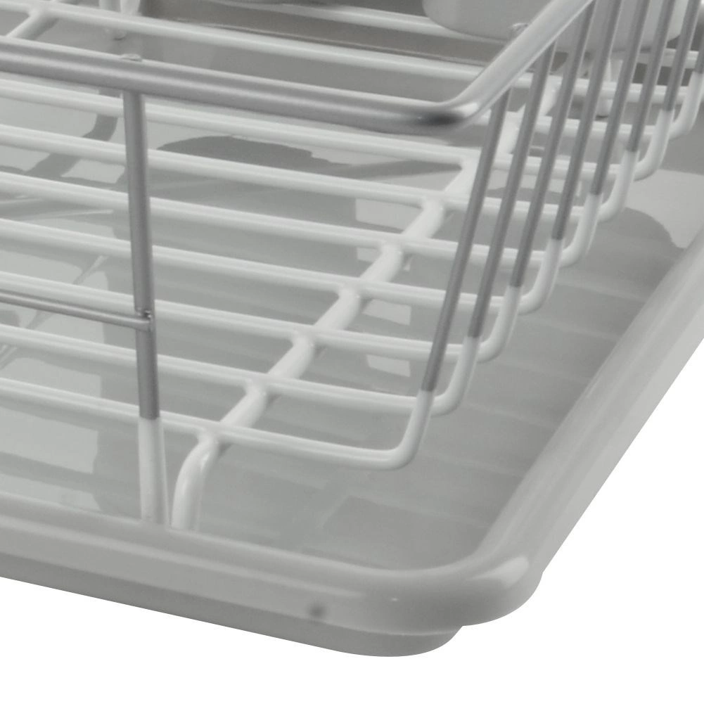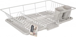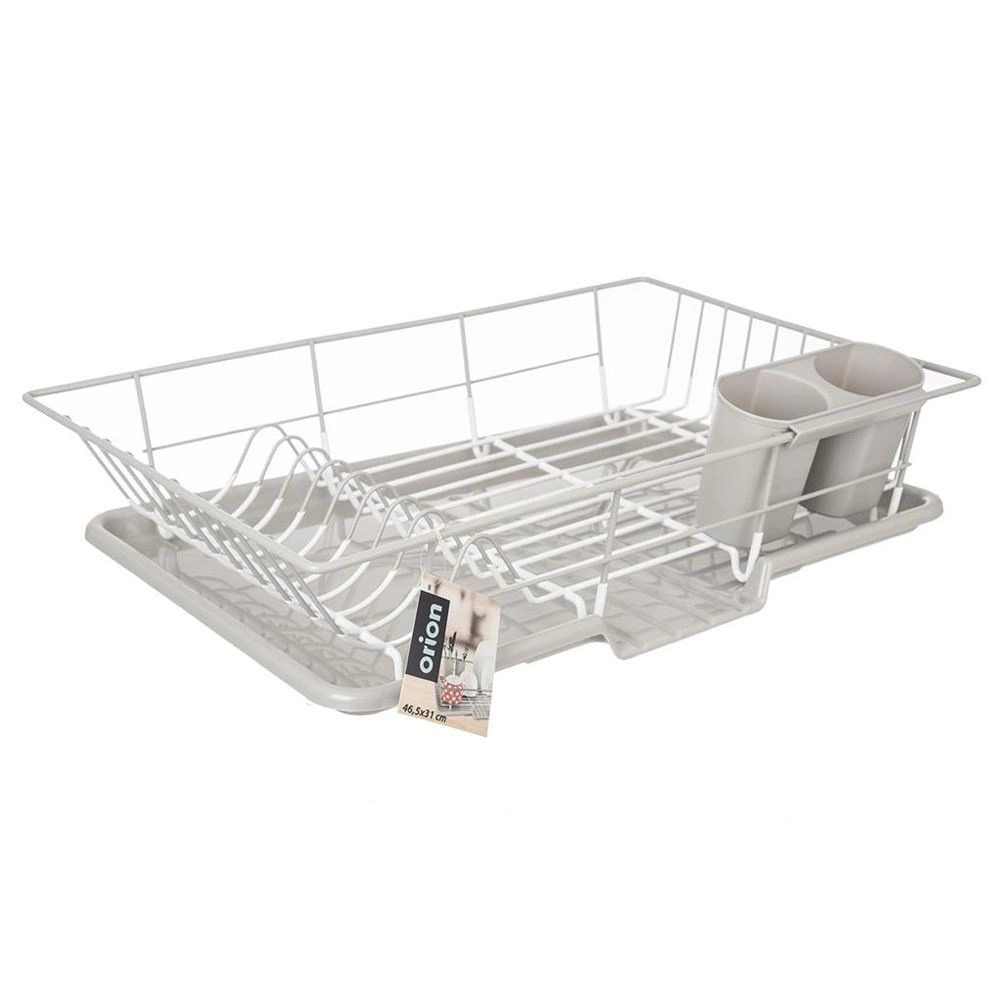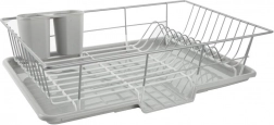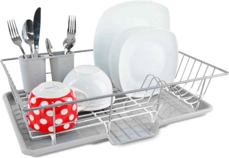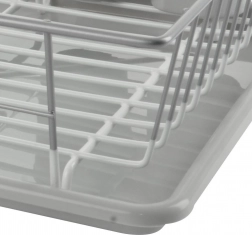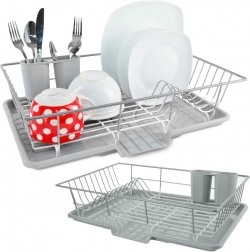 Elegantan i praktičan ocjeđivač za posuđe dimenzija 46,5 × 31 × 13 cm omogućuje udobno sušenje tanjura, zdjela, čaša i pribora bez nakupljanja vode na kuhinjskoj plohi. Metalna konstrukcija od nehrđajućeg čelika sa sivo-bijelim zaštitnim premazom stabilna je, otporna na koroziju i jednostavna za čišćenje.