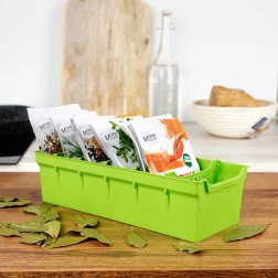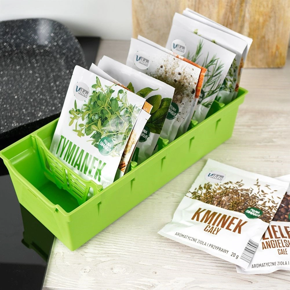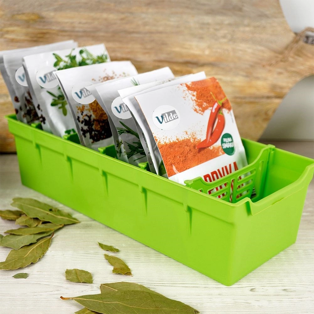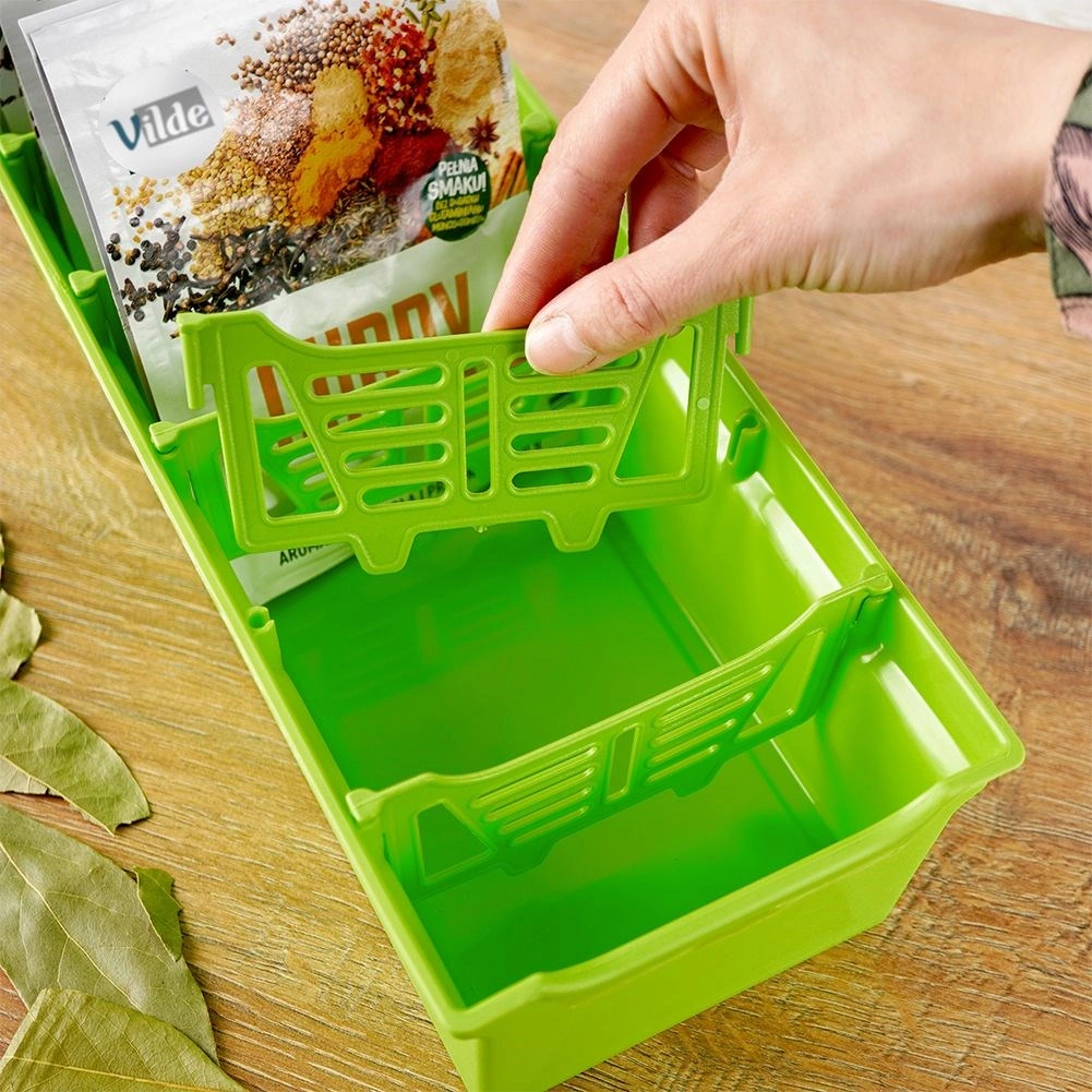 Organizirajte svoje biljke i začine pregledno i elegantno. Zeleni organizator za začine idealan je za pohranu vrećica sa začinima – bilo otvorenih ili zatvorenih. Unutra se nalazi pet izvlačnih pregrada koje dijele kutiju na šest odjeljaka, tako da dobivate dovoljno prostora i preglednosti za svakodnevno kuhanje.