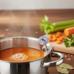 Raspon mjerenja -10 °C do +100 °C pokriva većinu kuhinjskih aktivnosti: od zagrijavanja mlijeka i dječjih obroka, preko pripreme domaće šunke, juha i sirupa, do kontrole temperature pri pečenju ili grilanju. Inox izvedba je higijenska, izdržljiva i lako se čisti, pa termometar odlično služi i kod kuće i u ugostiteljstvu.