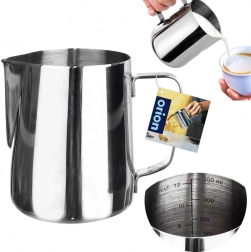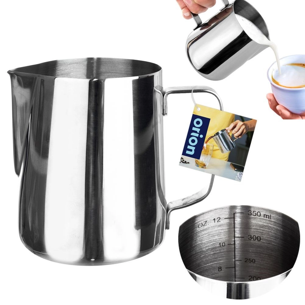 Nehrđajući vrč za mlijeko zapremnine 350 ml idealan je izbor za kućnu i kafićku pripremu kave. Zahvaljujući preciznom izljevom lako ćete uliti mlijeko u cappuccino ili latte, a unutarnja skala po 50 ml osigurava točno doziranje potrebne količine. Čvrsta ergonomska ručka olakšava rukovanje i pri vrućem sadržaju.