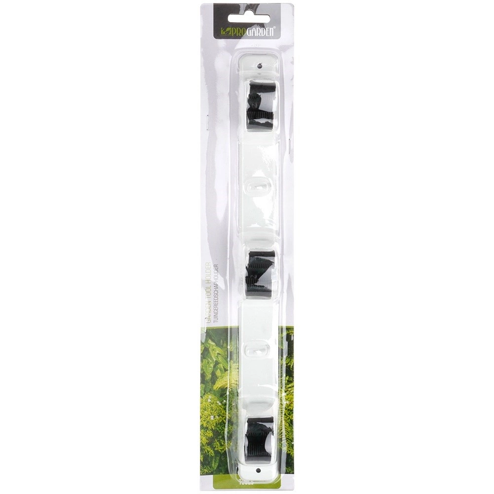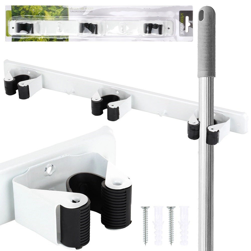 Trostruki zidni držač PROGARDEN pomaže održati red i imati sve pri ruci. Tri automatska opružna stezača čvrsto drže drške mopova, metli ili grablji, dok dvije praktične kuke služe za krpe, metlice ili lopatice. Zahvaljujući kombinaciji čvrstog metala i izdržljive plastike držač je stabilan, pouzdan i prikladan za svakodnevnu uporabu.