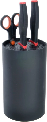 Praktičan i dizajnerski blok za noževe koji drži vaše oštrice sigurnima i nadohvat ruke. Zahvaljujući gustom četkastom umetku, noževe, škare i drugi pribor možete umećivati u bilo kojem položaju – bez utorâ i bez oštećenja oštrica. Kompaktne dimenzije štede prostor na kuhinjskoj radnoj plohi.
