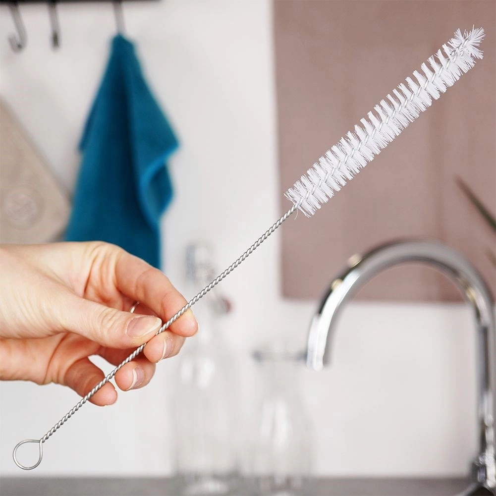 Ova duga i uska četka idealna je za čišćenje boca, vaza, cijevi i drugih posuda s uskim grlom. Metalna konstrukcija osigurava potrebnu krutost, dok guste plastične čekinje učinkovito uklanjaju naslage i na teško dostupnim mjestima. Ergonomska petlja na kraju omogućuje praktično vješanje i brz pristup pri svakodnevnoj uporabi.