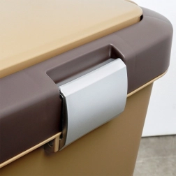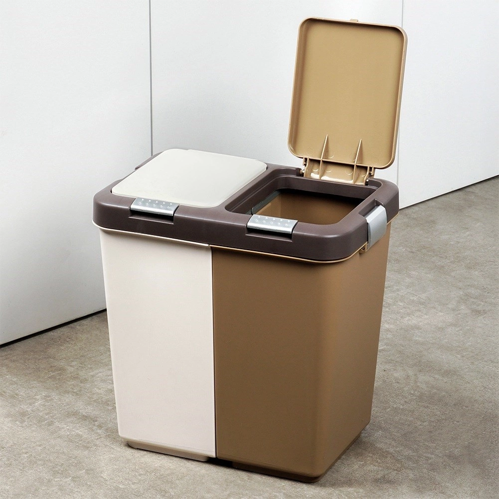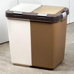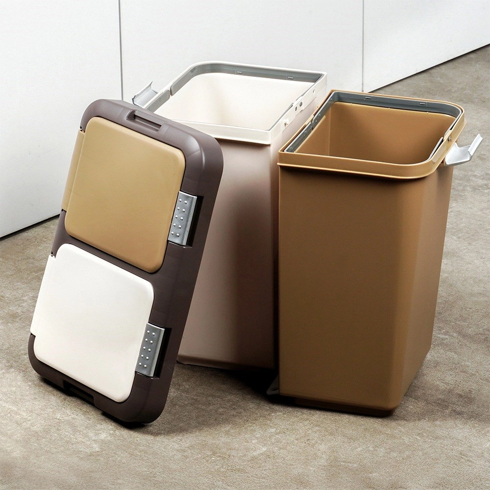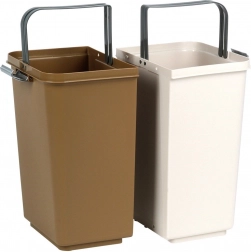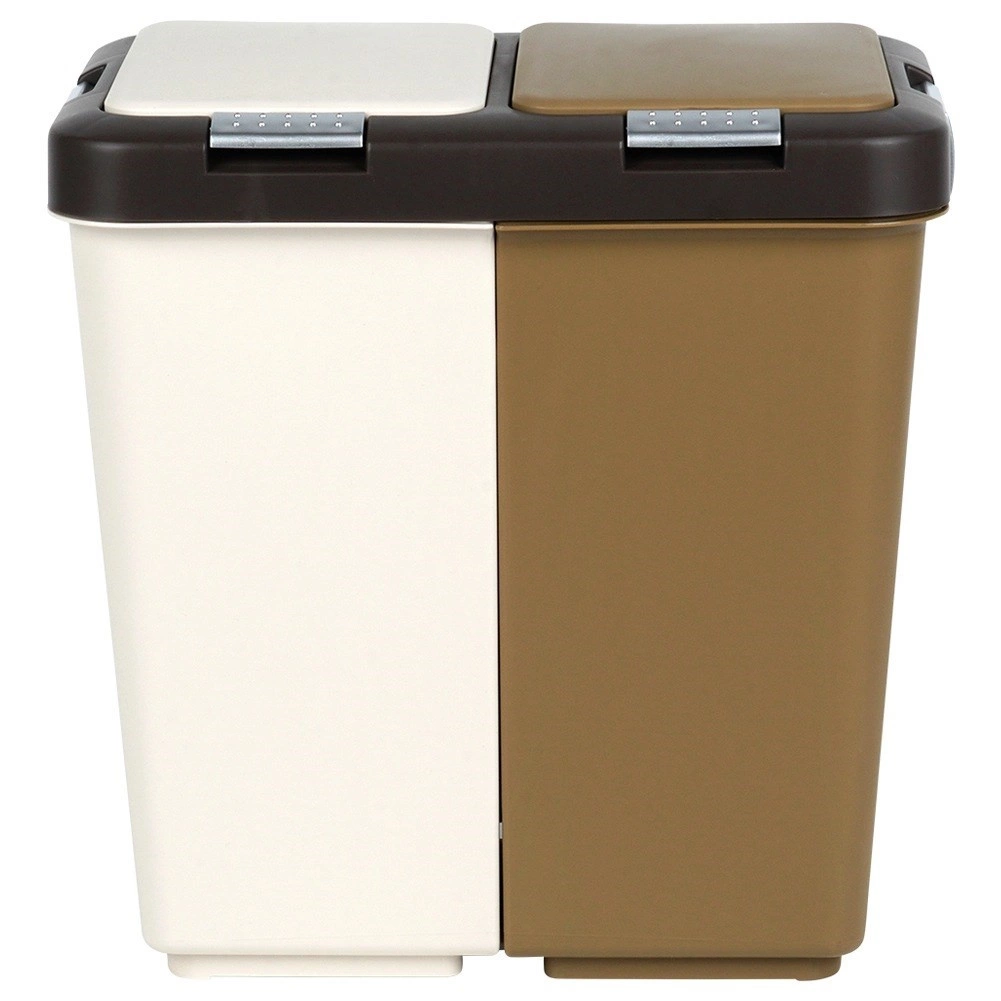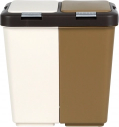 Kanta je izrađena od izdržljive plastike u kombinaciji bijele i smeđe boje, uklapa se u moderne i manje prostore. Kompaktne dimenzije štede prostor više nego dvije odvojene kante, a ujedno sprječavaju širenje neugodnih mirisa zahvaljujući zatvorenim poklopcima.