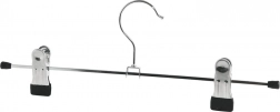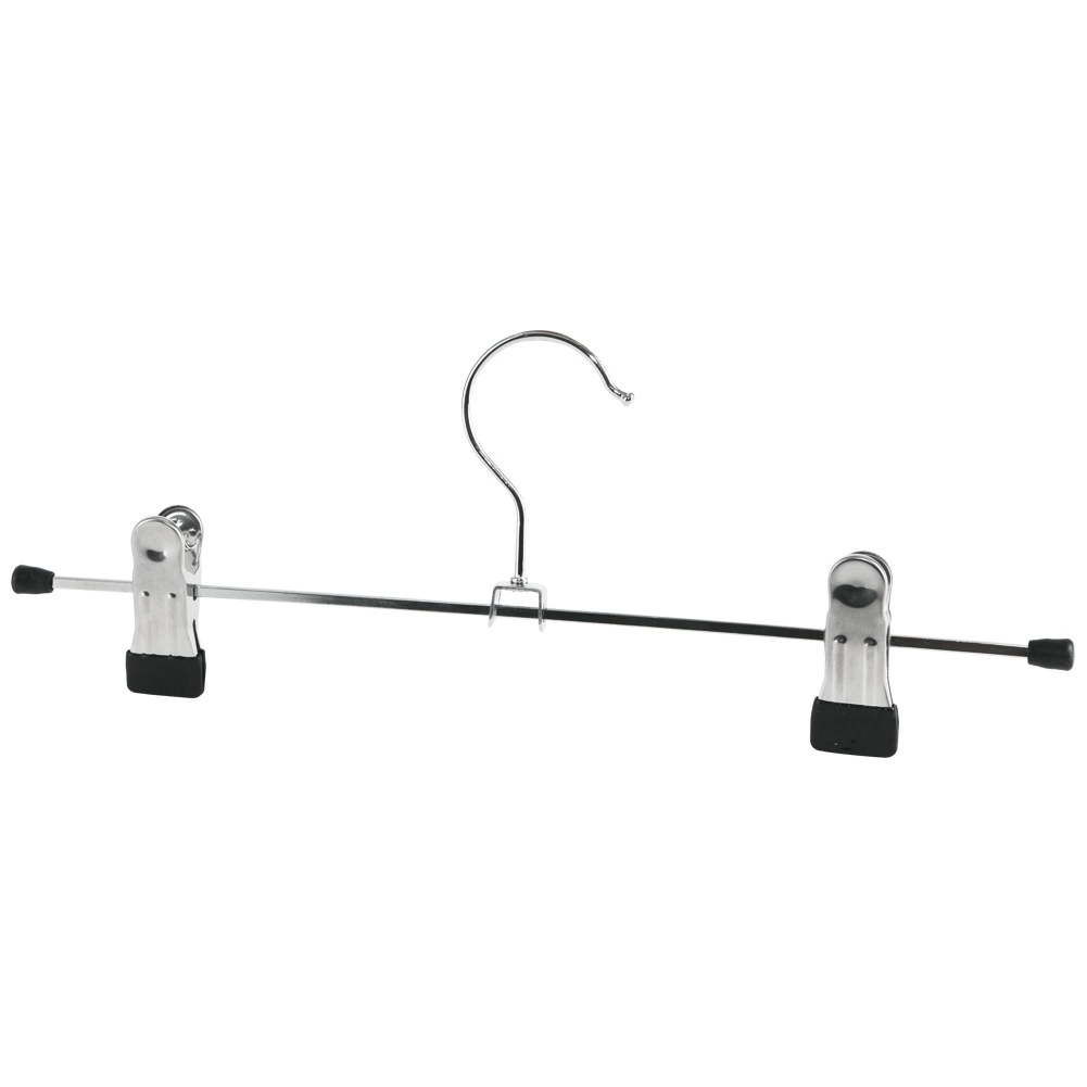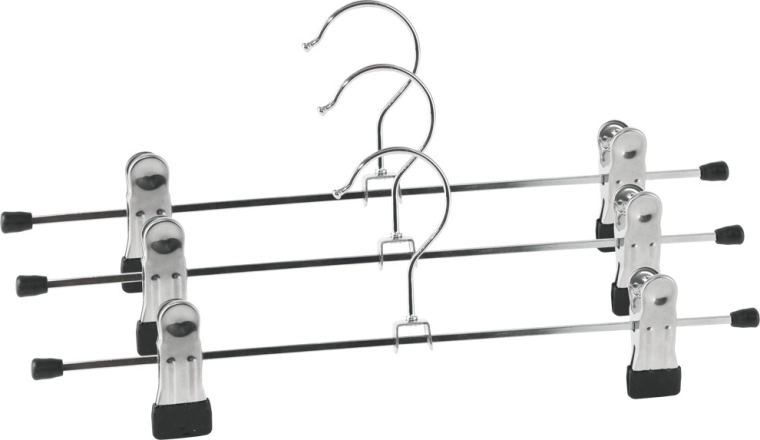 Set od 3 metalne vješalice s klipsama izvrstan je pomagač za organizaciju ormara. Robusna metalna izrada u elegantnoj srebrnoj boji i klipse s crnim završecima štite tkaninu od oštećenja. Zahvaljujući kliznim klipsama lako prilagodite razmak svakom komadu – od uskih suknji do širokih hlača.