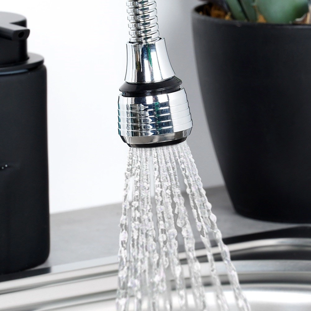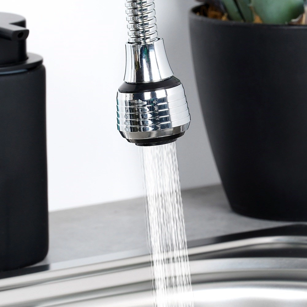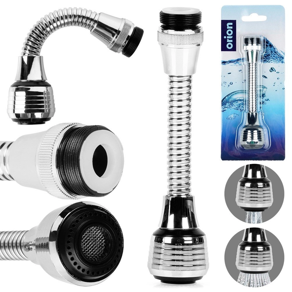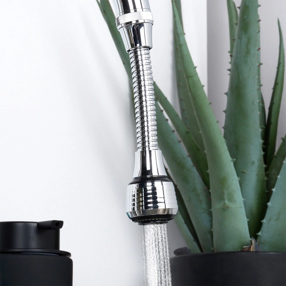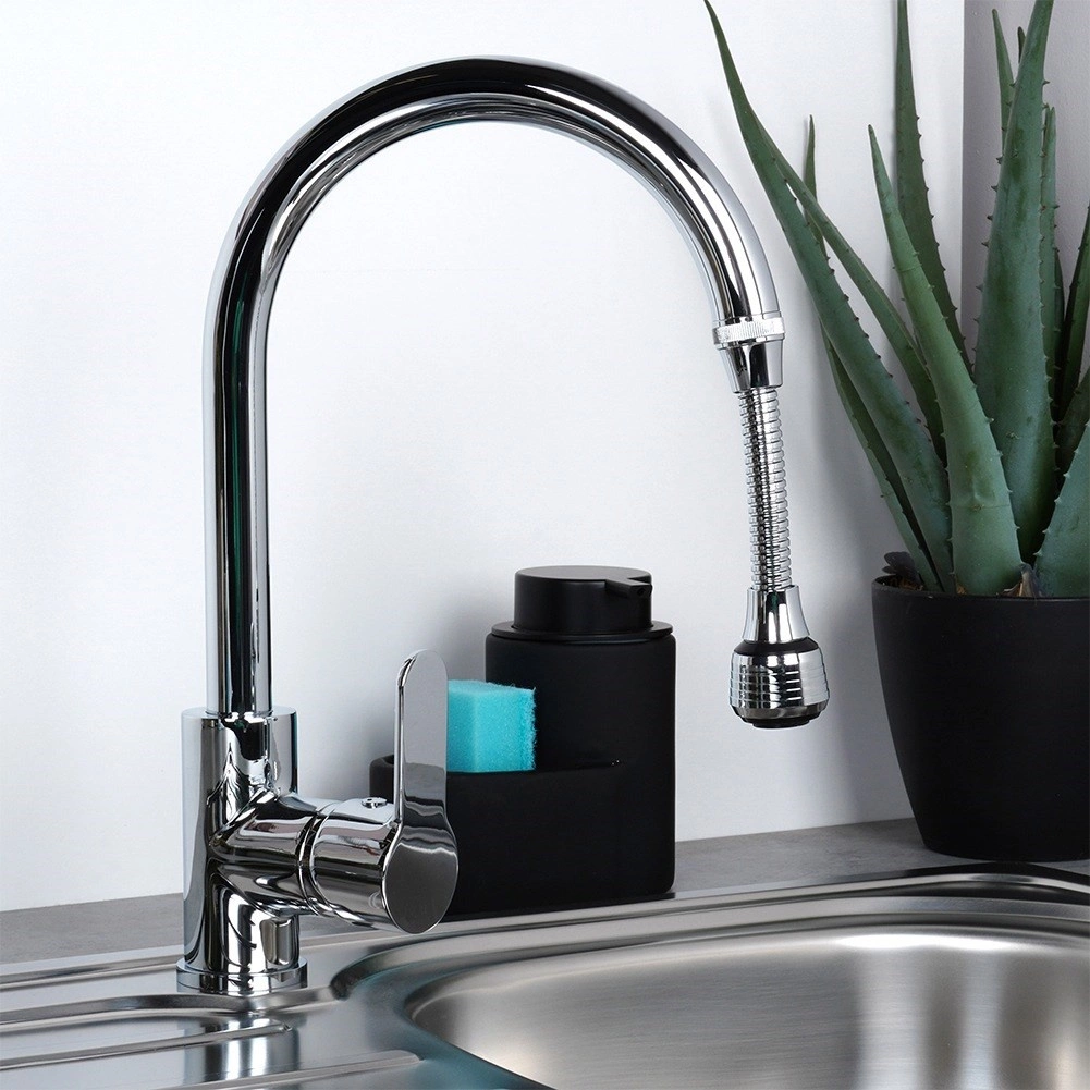 Fleksibilni guščji vrat omogućuje precizno usmjeravanje mlaza i smanjenje prskanja. Univerzalni priključak s vanjskim i unutarnjim navojem osigurava kompatibilnost s većinom standardnih slavina. Izdržljiva izvedba u srebrno‑crnom dizajnu praktična je i jednostavna za održavanje.