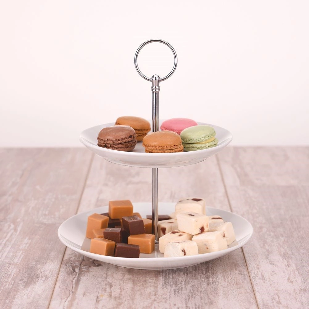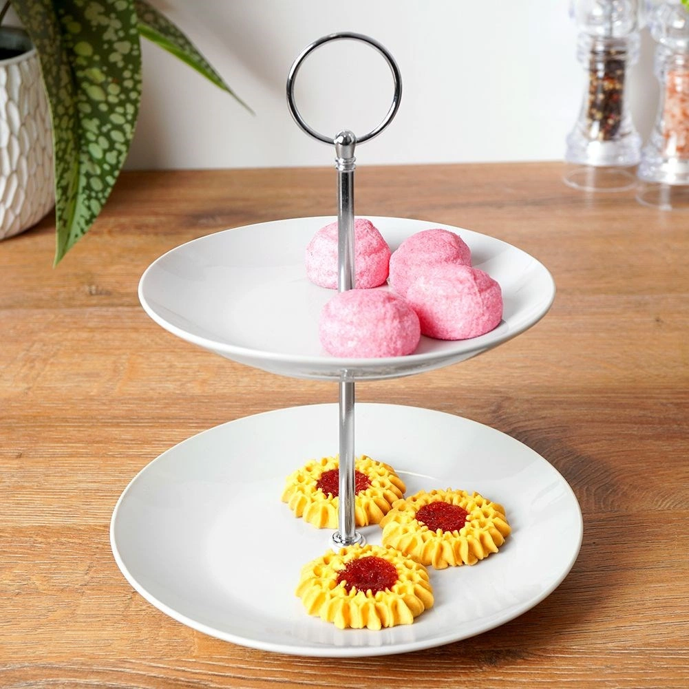 Ova dvokatna porculanska etažerica u bezvremenskoj bijeloj boji savršeno nadopunjuje svako posluživanje. Kreirajte stilizirani sweet bar ili elegantno poslužite voće, makrone, kolačiće ili slane zalogaje. Stabilna konstrukcija s metalnim središnjim stupom i praktičnim držačem omogućuje sigurno prenošenje i potpuno napunjenog stalka.