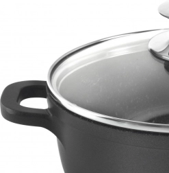 Praktični lonac GRANDE idealan je za svakodnevno kuhanje juha, umaka i jela iz jednog lonca. Aluminijsko tijelo osigurava brzo i ravnomjerno provođenje topline, dok neprianjajuća granitna površina PFLUON odolijeva ogrebotinama i omogućuje kuhanje s minimalno masnoće – za zdravija i ukusnija jela.