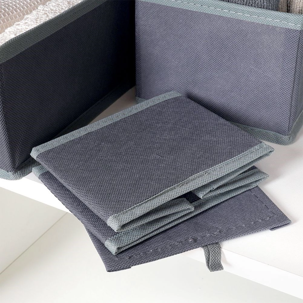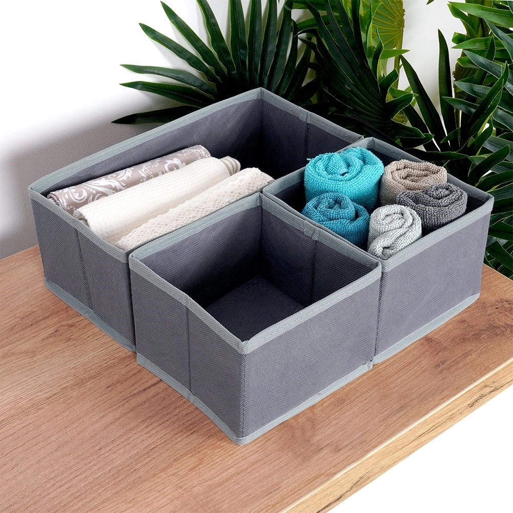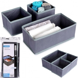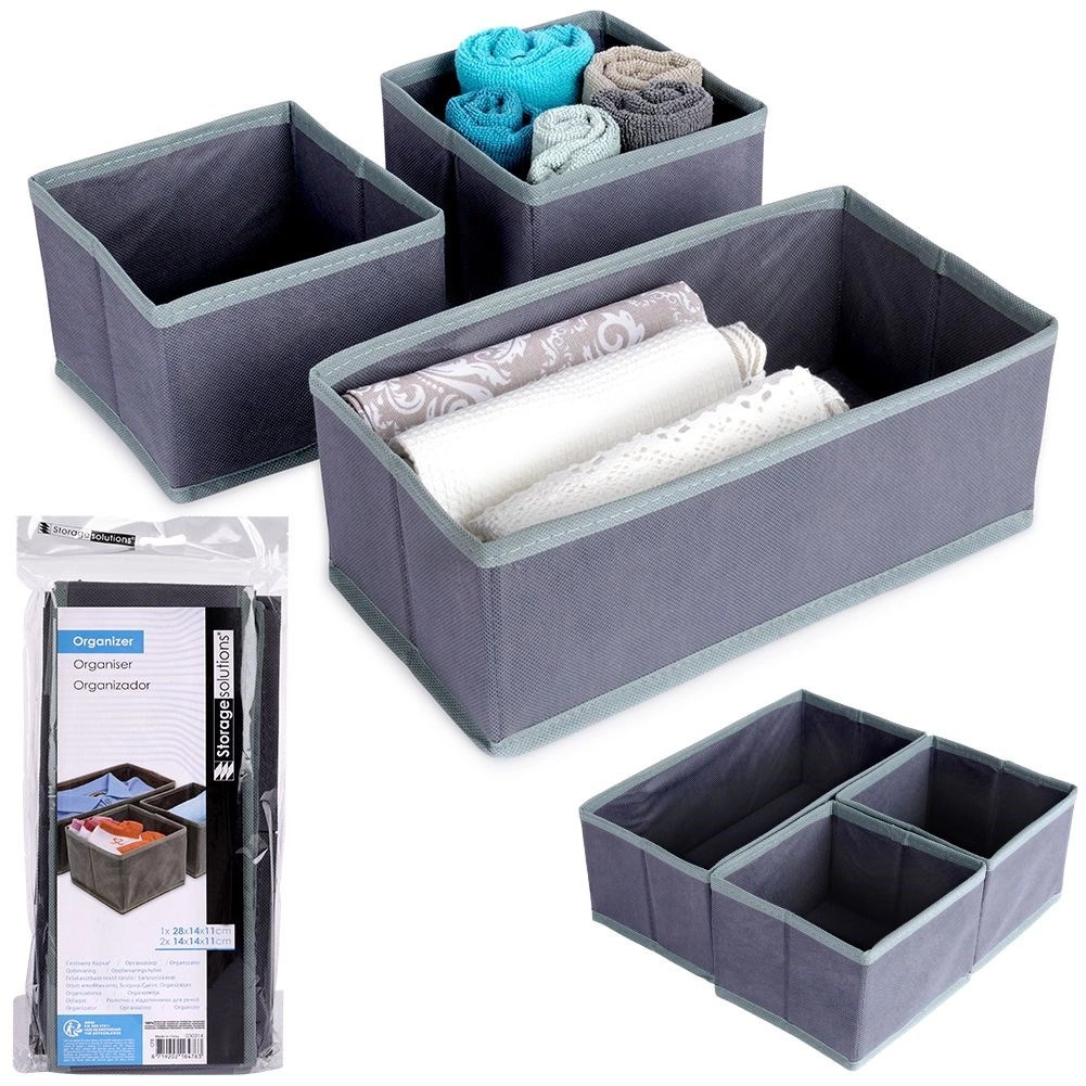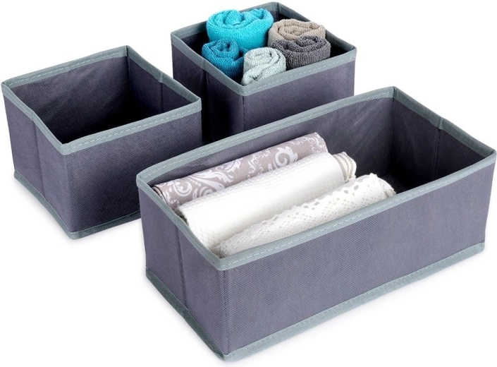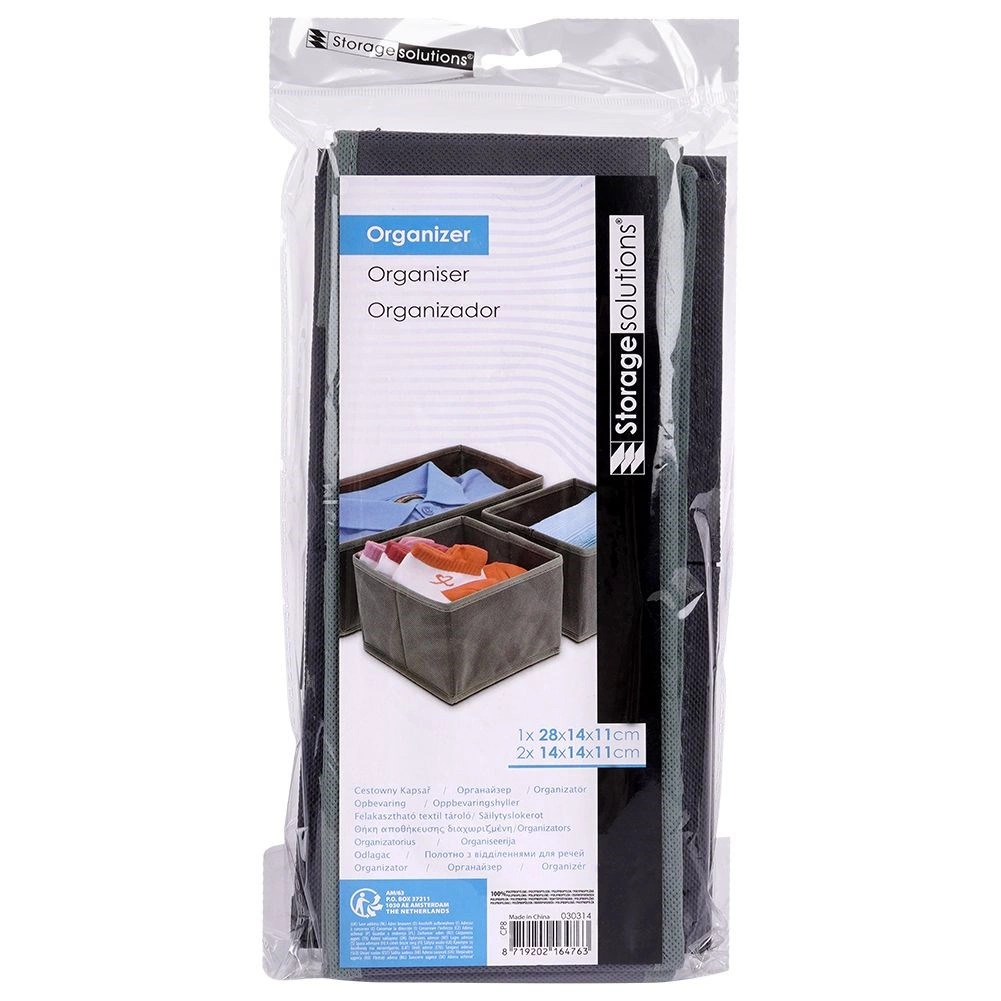 Set organizatora za ladice donosi brzo rješenje za pregledno odlaganje sitnica u spavaćoj sobi, garderobi i kupaonici. Dva manja kvadratna boxa i jedan veći pravokutni box stanu u većinu standardnih ladica i olakšavaju razvrstavanje rublja, modnih dodataka ili kozmetike. Meko tekstilno izvedenje s ojačanim rubovima drži oblik, a istovremeno štedi prostor.