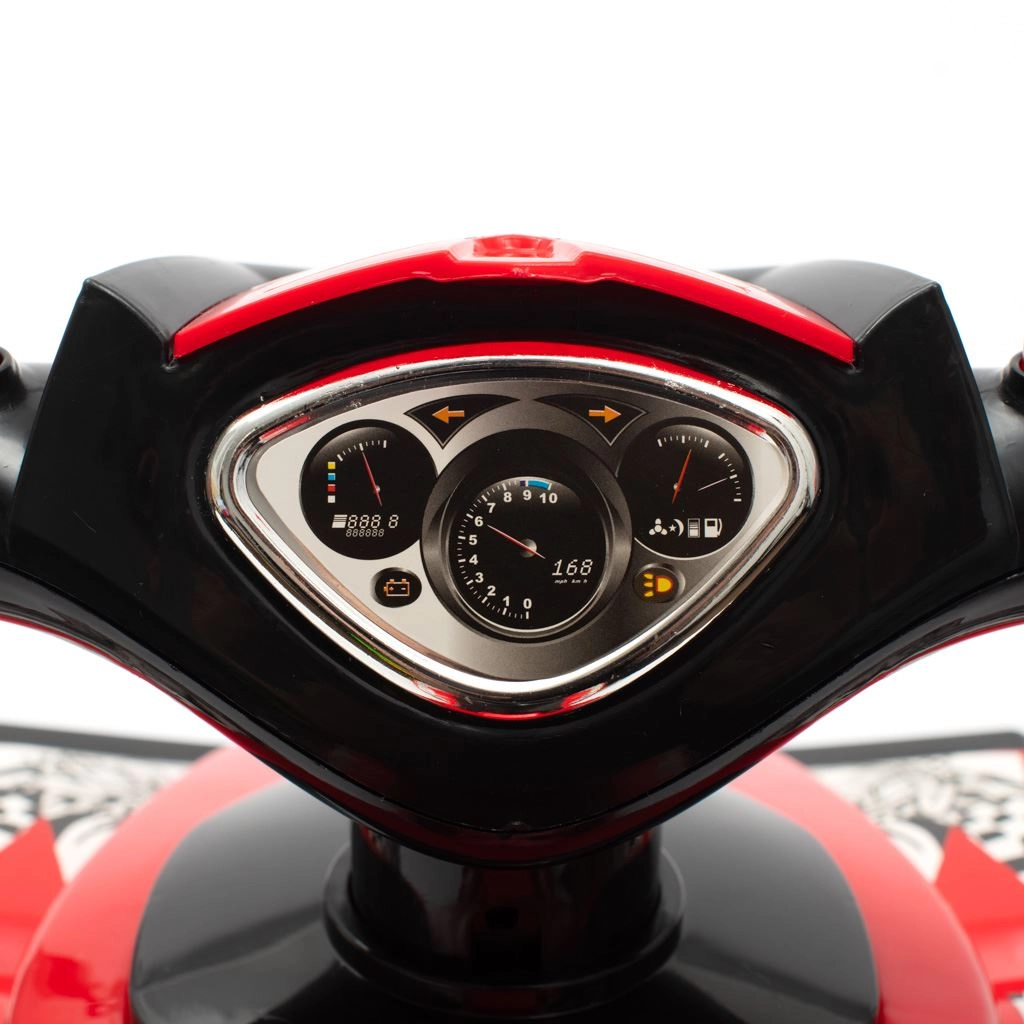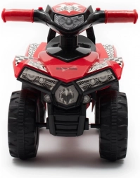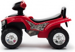 Četverokotača je izrađena od izdržljive, kvalitetne plastike i prikladna je za djecu koja već mogu samostalno sjediti. Ispod sjedala nalazi se spremnik za sitnice i omiljene igračke. Elektroničke funkcije (truba i tri melodije) napajaju se baterijama 2× AA 1,5 V (nisu uključene u pakiranje).