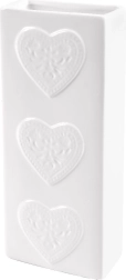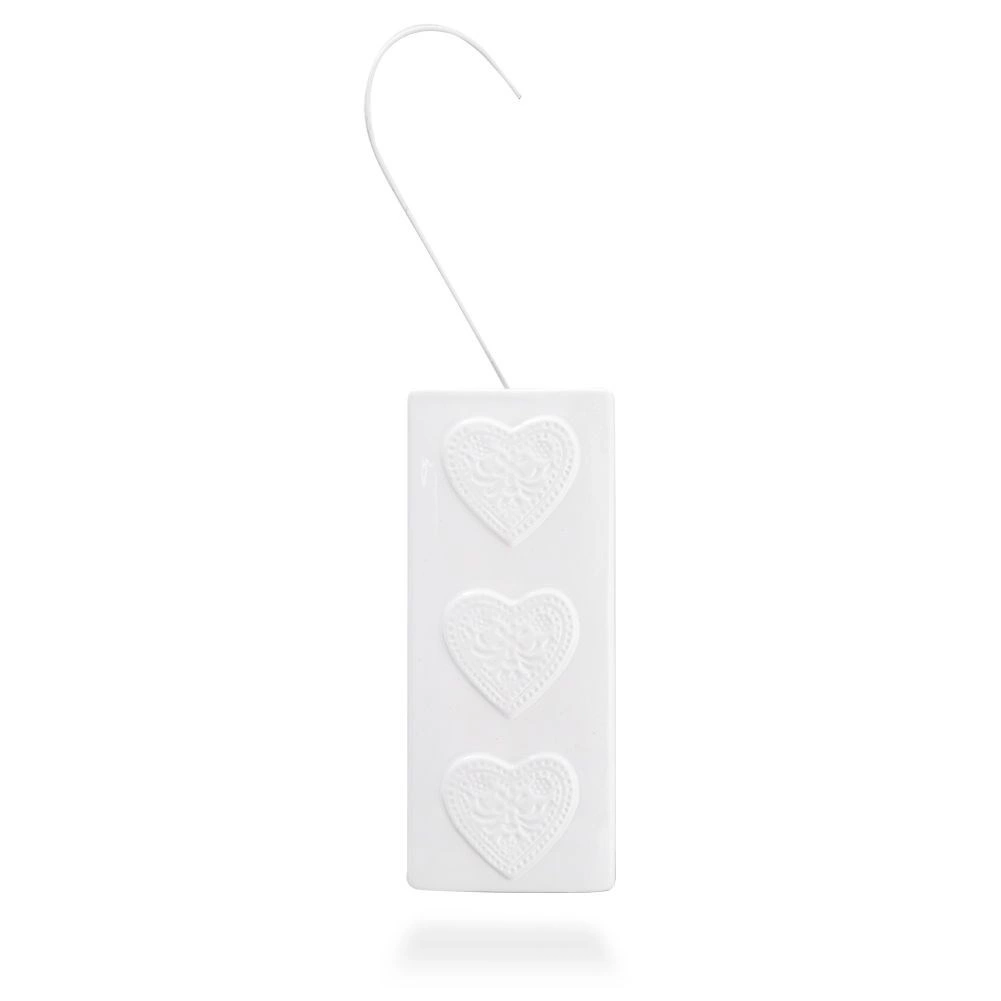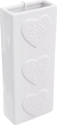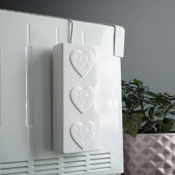 Izrađen od kvalitetne keramike u bijeloj boji sa sjajnom glazurom i trima plastičnim srcima na prednjoj strani. Uski i visoki oblik štedi prostor te omogućuje udobno vješanje na većinu uobičajenih radijatora bez alata.