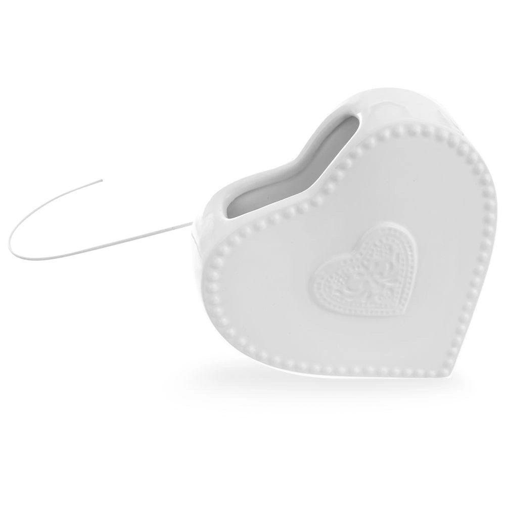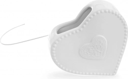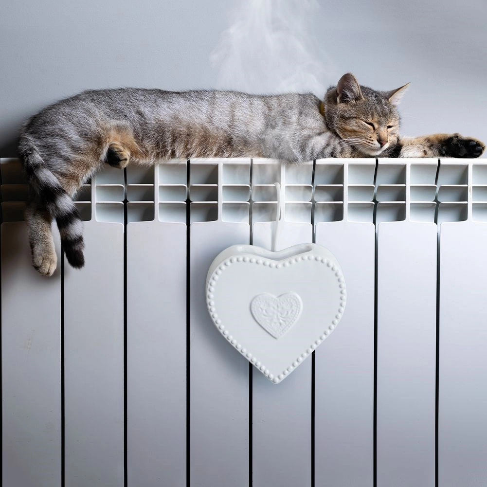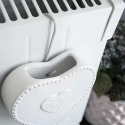Ovaj bijeli keramički ovlaživač za radijator s nježnim reljefom srca praktično je rješenje protiv suhog zraka u razdoblju grijanja. Dovoljno ga je napuniti vodom i objesiti na radijator pomoću metalne kukice – voda postupno isparava i poboljšava ugodu u prostoru.