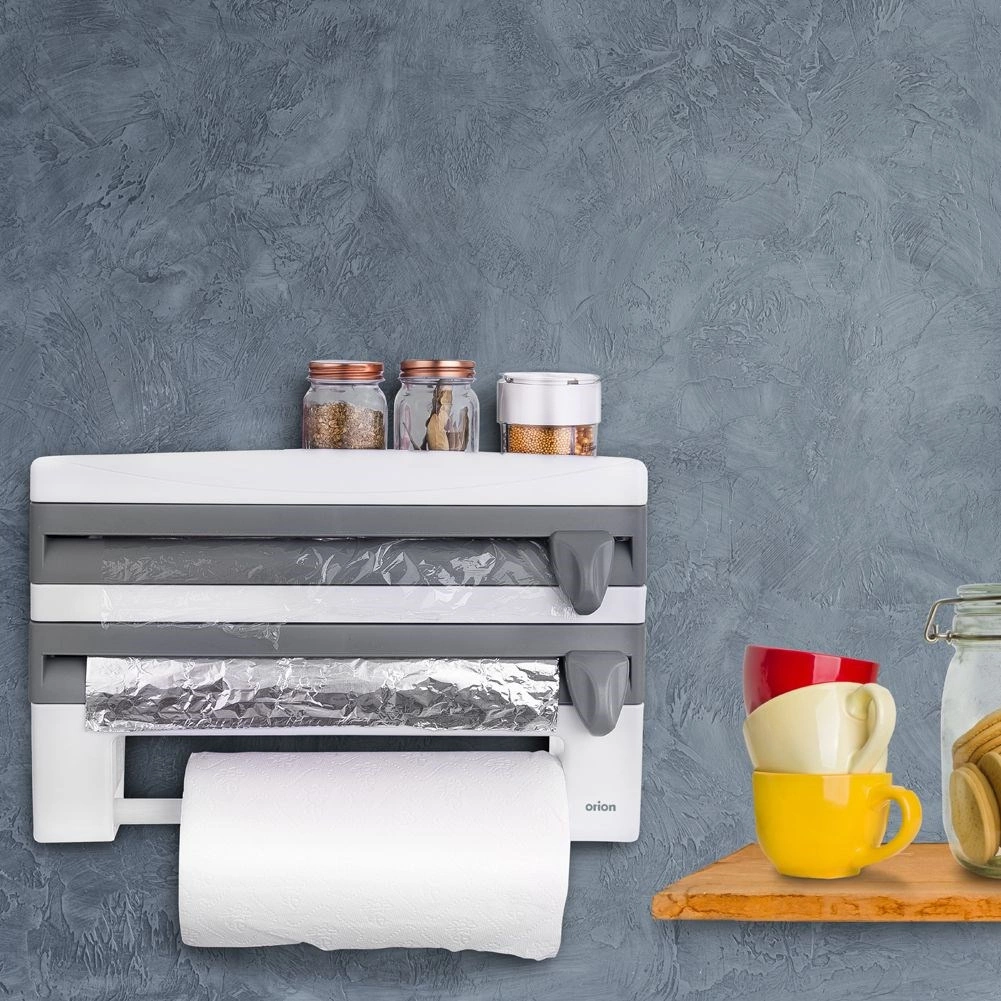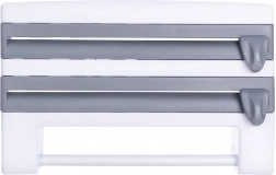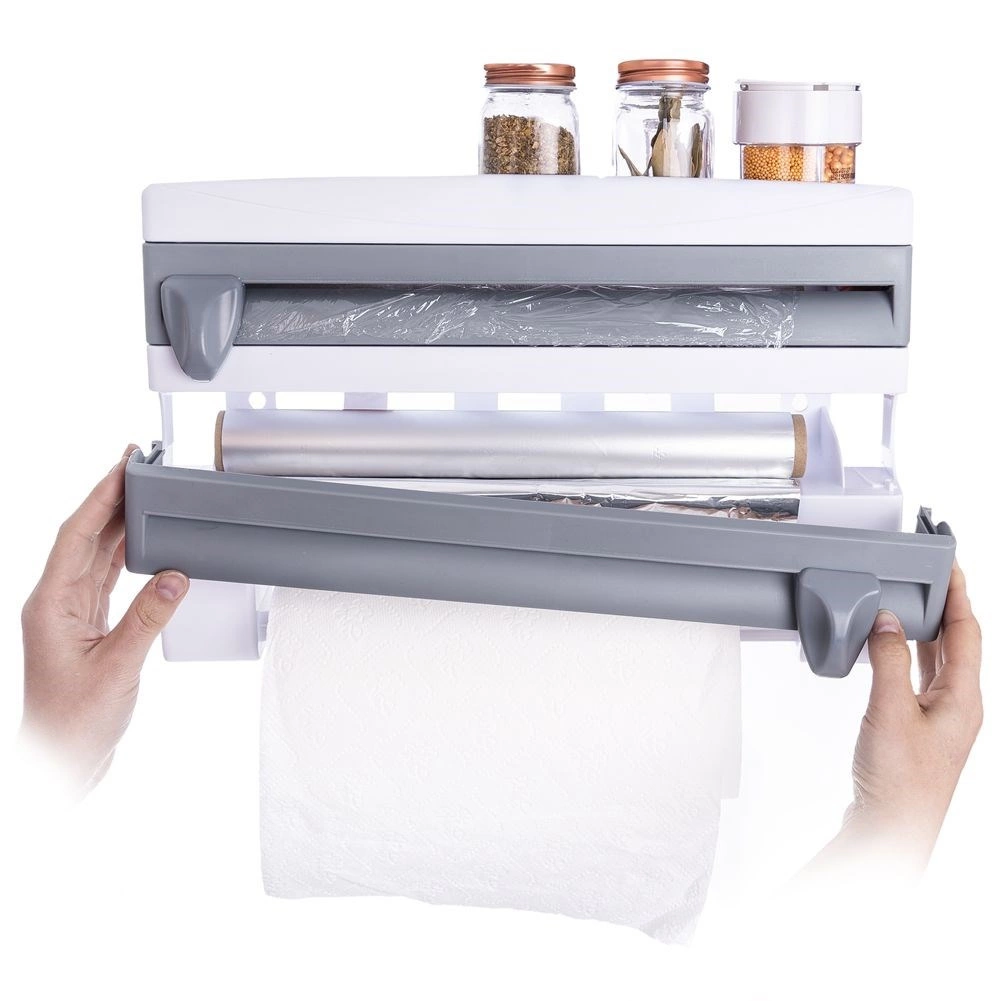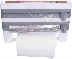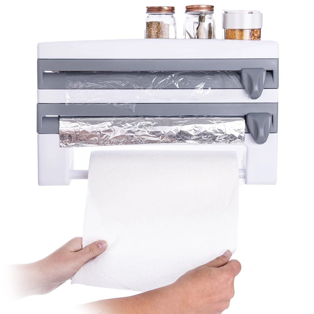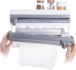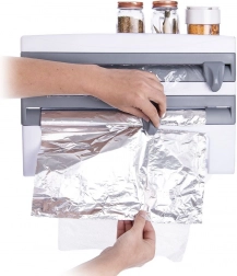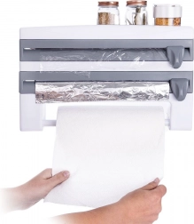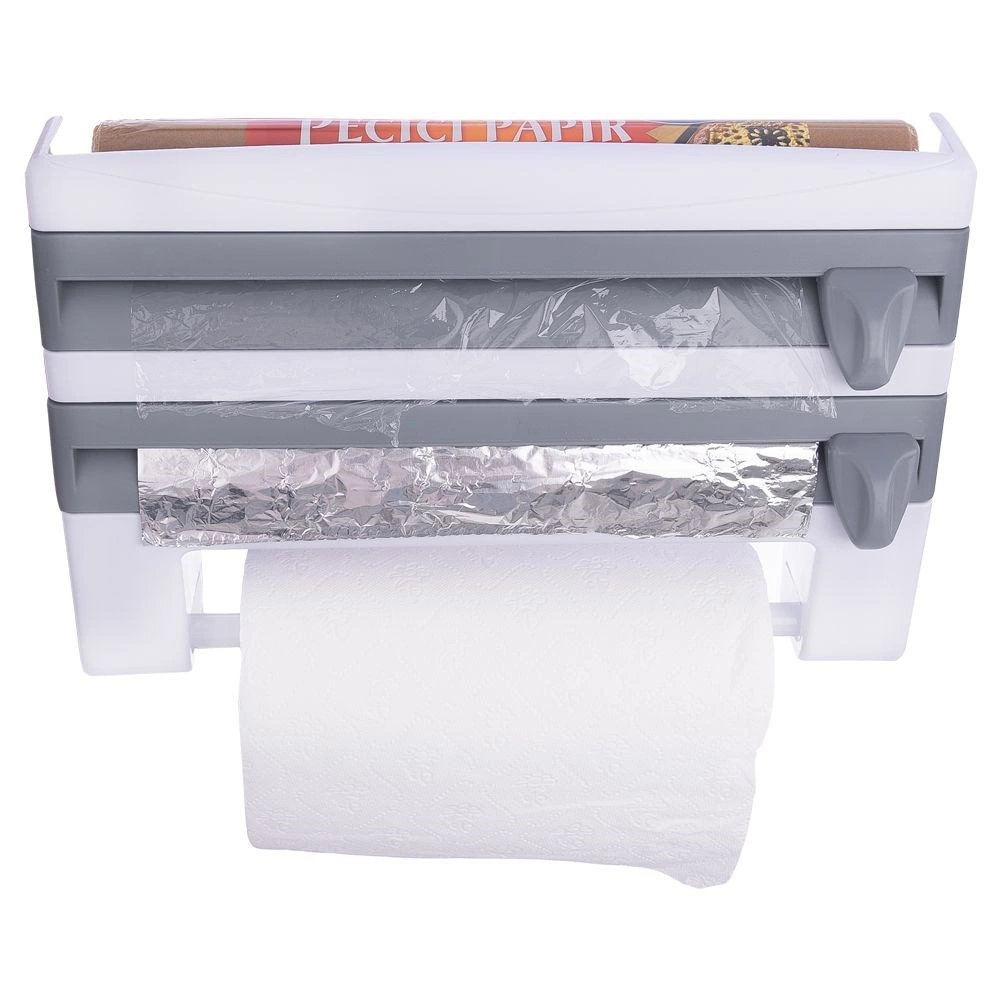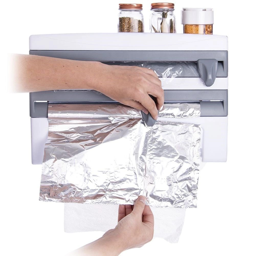 Zidni dozator folija i papirnatih ručnika 3-u-1 je pametno rješenje za svaku kuhinju i ugostiteljski pogon. Dva odvojena spremnika s integriranim noževima omogućuju glatko odmotavanje i sigurno, precizno rezanje prozirne i aluminijske folije. Donja šipka drži standardnu rolu papirnatih ručnika uvijek pri ruci, dok gornja polica pruža mjesto za začine, papir za pečenje ili male kuhinjske pomagala.