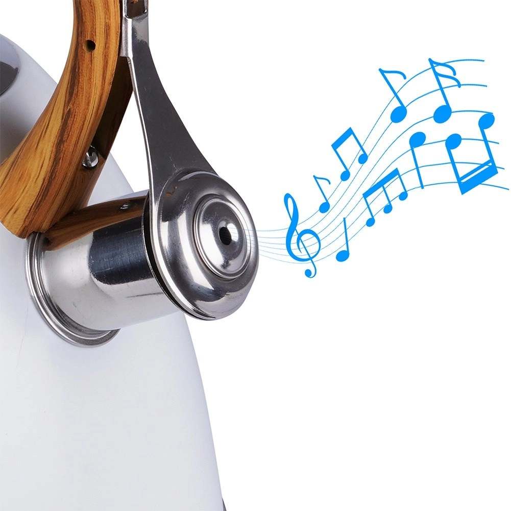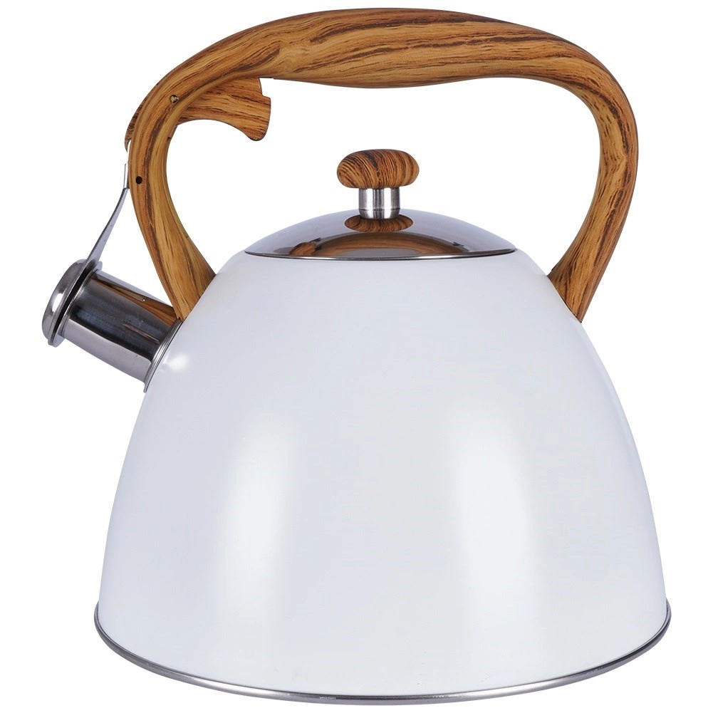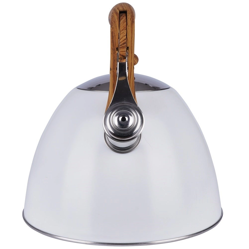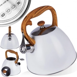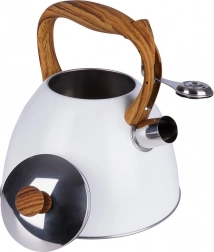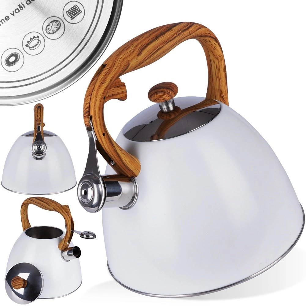 Ova klasična, dizajnerski čista kuhala spaja izdržljiv nehrđajući čelik s modernom bijelom površinom i udobnom drškom u dekoru drva. Zviždaljka s automatskim otvaranjem u dršci olakšava lijevanje, a široki poklopac praktično punjenje vodom i čišćenje. Zahvaljujući kvalitetnom materijalu ne narušava okus vode i osigurava učinkovit prijenos topline.