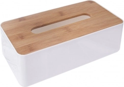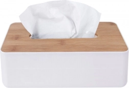 Dizajnerska kutija za maramice od kvalitetne bijele plastike s pokrovom od prirodnog bambusovog drva osigurava čist, moderan izgled i udobno doziranje maramica. Zahvaljujući dimenzijama 26 × 13 × 8,5 cm prima velika pakiranja i drži maramice uvijek pri ruci.