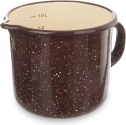 Stilska smeđa emajlirana šalica s bež točkastim uzorkom u retro dizajnu olakšava svakodnevno kuhanje i pečenje. Zahvaljujući praktičnom izljevom, točenje je jednostavno, a unutarnja mjerna skala omogućuje precizno doziranje tekućina i suhih sastojaka bez dodatnih pomagala. Čvrsta ručka osigurava sigurnu i udobnu manipulaciju.
